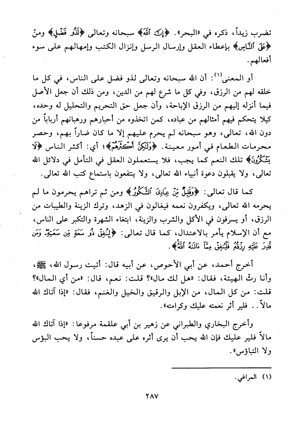 كما قال تعالى: {وَقَلِيلٌ مِنْ عِبَادِيَ الشَّكُورُ} ومن ثم تراهم يحرمون ما لم يحرمه الله تعالى، ويكفرون نعمه فيغالون في الزهد، وترك الزينة والطيبات من الرزق، أو يسرفون في الأكل والشرب والزينة، ابتغاء الشهرة والتكبر على الناس، مع أن الإِسلام يأمر بالاعتدال، كما قال تعالى: {لِيُنْفِقْ ذُو سَعَةٍ مِنْ سَعَتِهِ وَمَنْ قُدِرَ عَلَيْهِ رِزْقُهُ فَلْيُنْفِقْ مِمَّا آتَاهُ اللَّهُ}.