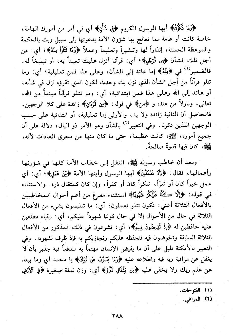 61 - {وَمَا تَكُونُ} أيها الرسول الكريم {فِي شَأْنٍ} أي في أمر من أمورك الهامة، خاصة كانت أو عامة مما تعالج بها شؤون الأمة بدعوتها إلى سبيل ربك بالحكمة والموعظة الحسنة، إنذارًا لها وتبشيرًا وتعليمًا وعملًا {وَمَا تَتْلُو مِنْهُ}؛ أي: من أجل ذلك الشأن {مِنْ قُرْآنٍ}؛ أي: قرآنا أنزل عليك تعبدًا به، أو تبليغًا له. فالضمير (¬1) في {مِنْهُ} إما عائد إلى الشأن، وعلى هذا فمن تعليلية؛ أي: وما تتلو قرآنًا من أجل الشأن الذي نزل بك وحدث لكون الذي تقرؤه نزل في شأنه، أو عائد إلى الله وعلى على هذا فمن ابتدائية؛ أي: وما تتلو قرآنًا مبتدأً من الله، تعالى، ونازلًا من عنده و {من} في قوله: {مِنْ قُرْآنٍ} زائدة عل كلا الوجهين، فالحاصل أن الثانية زائدة ولا بد، والأولى إما تعليلية، أو ابتدائية على حسب الوجهين اللذين ذكرنا. وفي التعبير (¬2) بالشأن وهو الأمر ذو البال، دلالة على أن جميع أموره، - صلى الله عليه وسلم -، كانت عظيمة، حتى ما كان منها من مجرى العادات لأنه، - صلى الله عليه وسلم -، كان فيها قدوةً صالحةً.