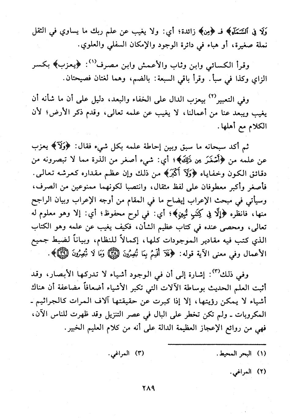 وفي التعبير (¬2) بيعزب الدال على الخفاء والبعد، دليل على أن ما شأنه أن يغيب ويبعد عنا من أعالنا، لا يغيب عن علمه تعالى، وقدم ذكر الأرض؛ لأن الكلام مع أهلها.