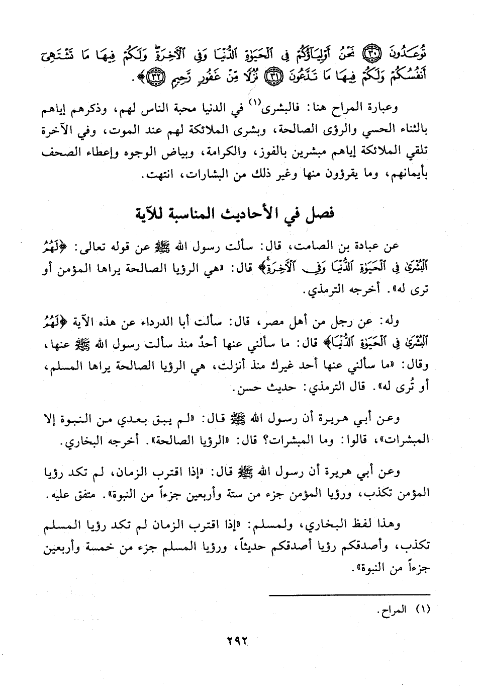 عن عبادة بن الصامت، قال: سألت رسول الله - صلى الله عليه وسلم - عن قوله تعالى: {لَهُمُ الْبُشْرَى فِي الْحَيَاةِ الدُّنْيَا} قال: "هي الرؤيا الصالحة يراها المؤمن أو ترى له". أخرجه الترمذي.