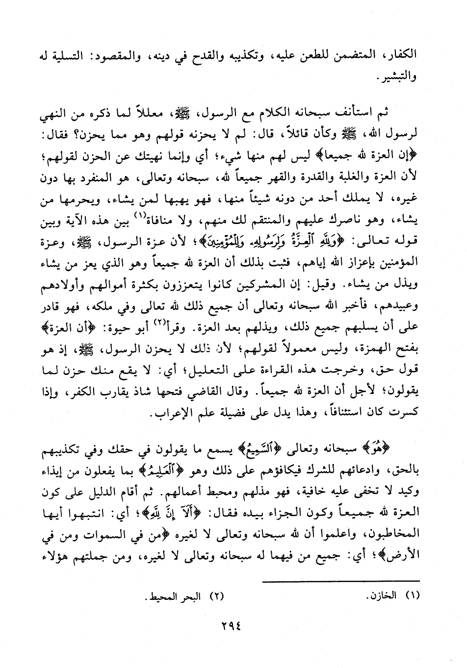 ثم استأنف سبحانه الكلام مع الرسول، - صلى الله عليه وسلم -، معللًا لما ذكره من النهي لرسول الله، - صلى الله عليه وسلم - وكأن قائلًا، قال: لم لا يحزنه قولهم وهو مما يحزن؟ فقال: {إن العزة لله جميعًا} ليس لهم منها شيء؛ أي وإنما نهيتك عن الحزن لقولهم؛ لأن العزة والغلبة والقدرة والقهر جميعًا لله، سبحانه وتعالى، هو المنفرد بها دون غيره، لا يملك أحد من دونه شيئًا منها، فهو يهبها لمن يشاء، ويحرمها من يشاء، وهو ناصرك عليهم والمنتقم لك منهم، ولا منافاة (¬1) بين هذه الآية وبين قوله تعالى: {وَلِلَّهِ الْعِزَّةُ وَلِرَسُولِهِ وَلِلْمُؤْمِنِينَ}؛ لأن عزة الرسول، - صلى الله عليه وسلم -، وعزة المؤمنين بإعزاز الله إياهم، فثبت بذلك أن العزة لله جميعًا وهو الذي يعز من يشاء ويذل من يشاء. وقيل: إن المشركين كانوا يتعززون بكثرة أموالهم وأولادهم وعبيدهم، فأخبر الله سبحانه وتعالى أن جميع ذلك لله تعالى وفي ملكه، فهو قادر على أن يسلبهم جميع ذلك، ويذلهم بعد العزة. وقرأ (¬2) أبو حيوة: {أن العزة} بفتح الهمزة، وليس معمولًا لقولهم؛ لأن ذلك لا يحزن الرسول، - صلى الله عليه وسلم -، إذ هو قول حق، وخرجت هذه القراءة على التعليل؛ أي: لا يقع منك حزن لما يقولون؛ لأجل أن العزة لله جميعًا. وقال القاضي فتحها شاذ يقارب الكفر، وإذا كسرت كان استئنافًا، وهذا يدل على فضيلة علم الإعراب.