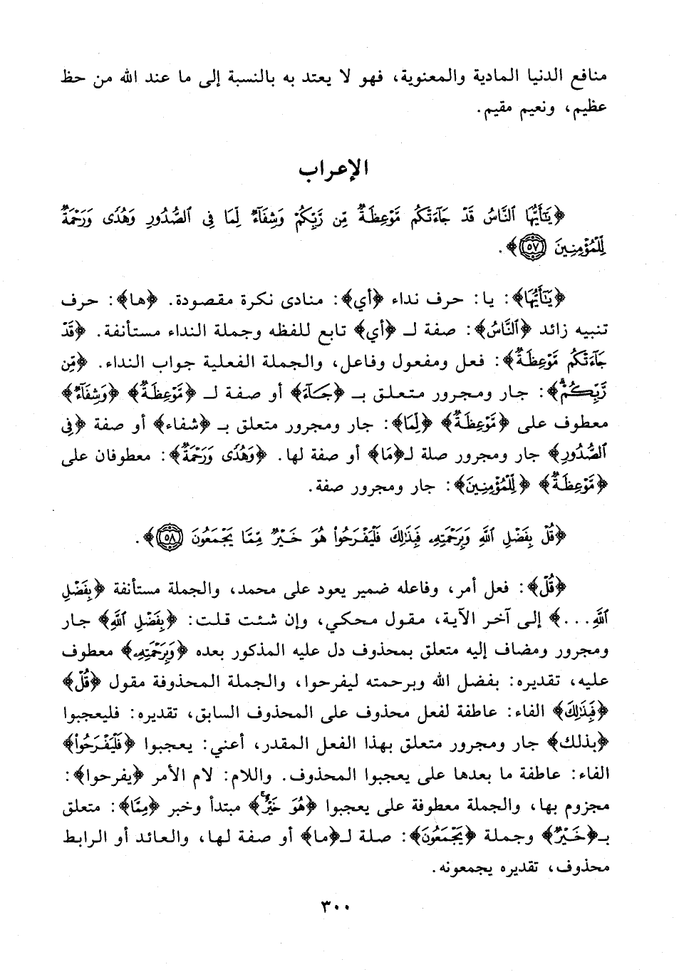 {يَا أَيُّهَا}: يا: حرف نداء {أي}: منادى نكرة مقصودة. {ها}: حرف تنبيه زائد {النَّاسُ}: صفة لـ {أي} تابع للفظه وجملة النداء مستأنفة. {قَدْ جَاءَتْكُمْ مَوْعِظَةٌ}: فعل ومفعول وفاعل، والجملة الفعلية جواب النداء. {مِنْ رَبِّكُمْ}: جار ومجرور متعلق بـ {جَاء} أو صفة لـ {مَوْعِظَةٌ} {وَشِفَاءٌ} معطوف على {مَوْعِظَةٌ} {لِمَا}: جار ومجرور متعلق بـ {شفاء} أو صفة {فِي الصُّدُورِ} جار ومجرور صلة لـ {مَا} أو صفة لها. {وَهُدًى وَرَحْمَةٌ}: معطوفان على {مَوْعِظَةٌ} {لِلْمُؤْمِنِينَ}: جار ومجرور صفة.