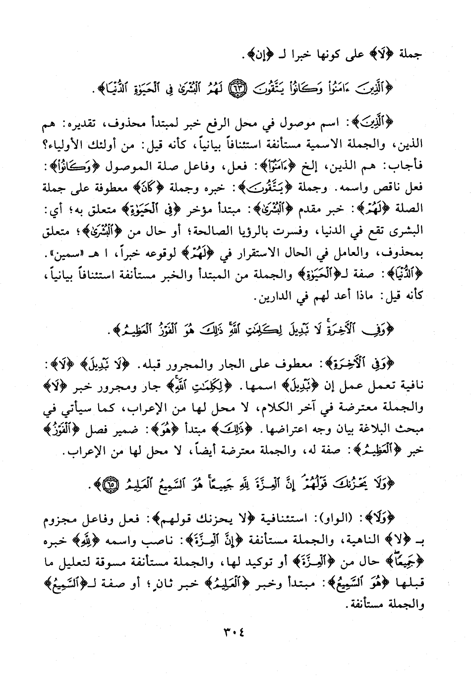 {وَلَا}: {الواو}: استئنافية {لا يحزنك قولهم}: فعل وفاعل مجزوم بـ {لا} الناهية، والجملة مستأنفة {إِنَّ الْعِزَّةَ}: ناصب واسمه {لِلَّهِ} خبره {جَمِيعًا} حال من {الْعِزَّةَ} أو توكيد لها، والجملة مستأنفة مسوقة لتعليل ما قبلها {هُوَ السَّمِيعُ}: مبتدأ وخبر {الْعَلِيمُ} خبر ثانٍ؛ أو صفة لـ {السَّمِيعُ} والجملة مستأنفة.