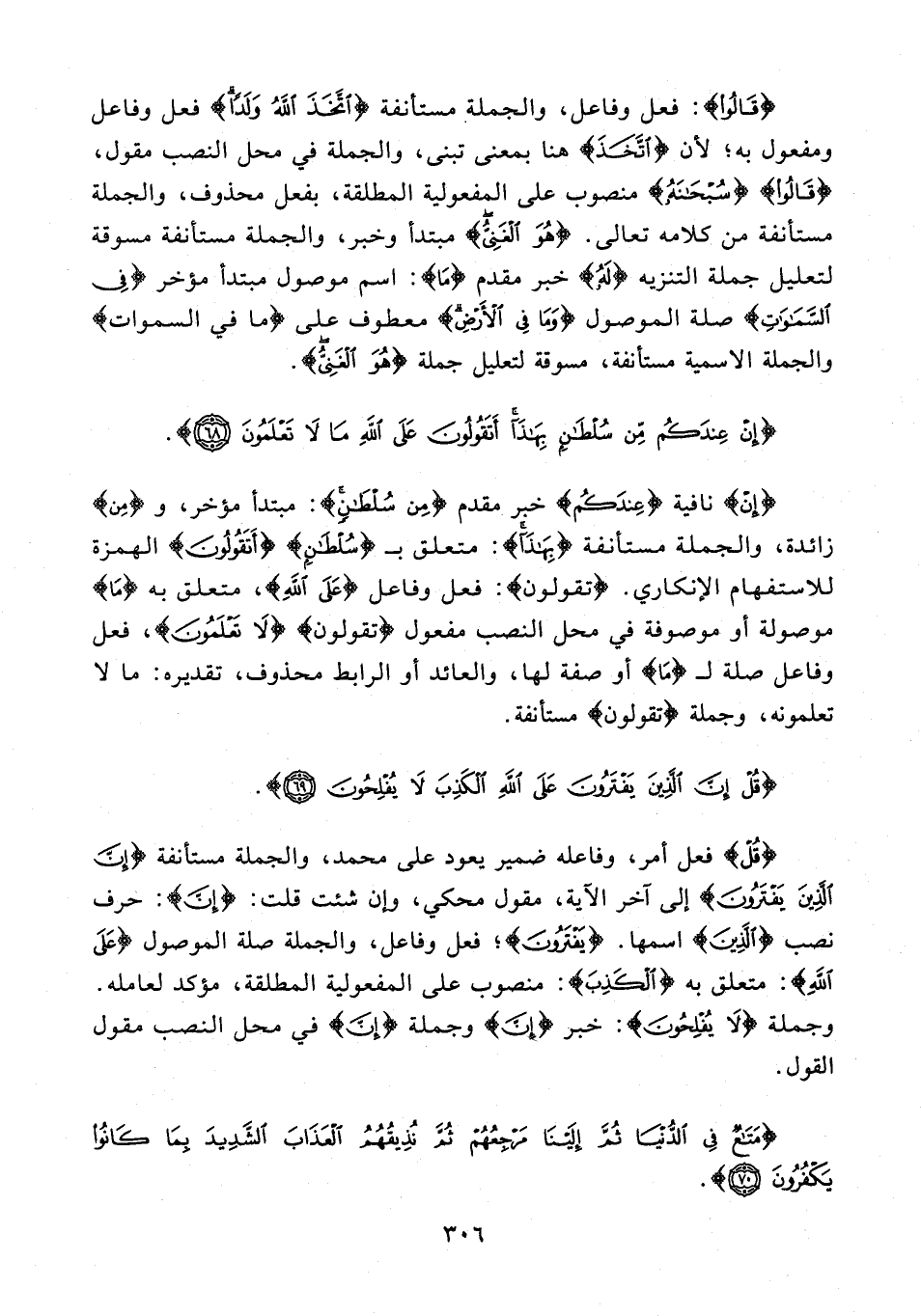 {قَالُوا}: فعل وفاعل، والجملة مستأنفة {اتَّخَذَ اللَّهُ وَلَدًا} فعل وفاعل ومفعول به؛ لأن {اتَّخَذَ} هنا بمعنى تبنى، والجملة في محل النصب مقول، {قَالُوا} {سُبْحَانَهُ} منصوب على المفعولية المطلقة، بفعل محذوف، والجملة مستأنفة من كلامه تعالى. {هُوَ الْغَنِيُّ} مبتدأ وخبر، والجملة مستأنفة مسوقة لتعليل جملة التنزيه {لَهُ} خبر مقدم {مَا}: اسم موصول مبتدأ مؤخر {فِي السَّمَاوَاتِ} صلة الموصول {وَمَا فِي الْأَرْضِ} معطوف على {ما في السموات} والجملة الاسمية مستأنفة، مسوقة لتعليل جملة {هُوَ الْغَنِيُّ}.