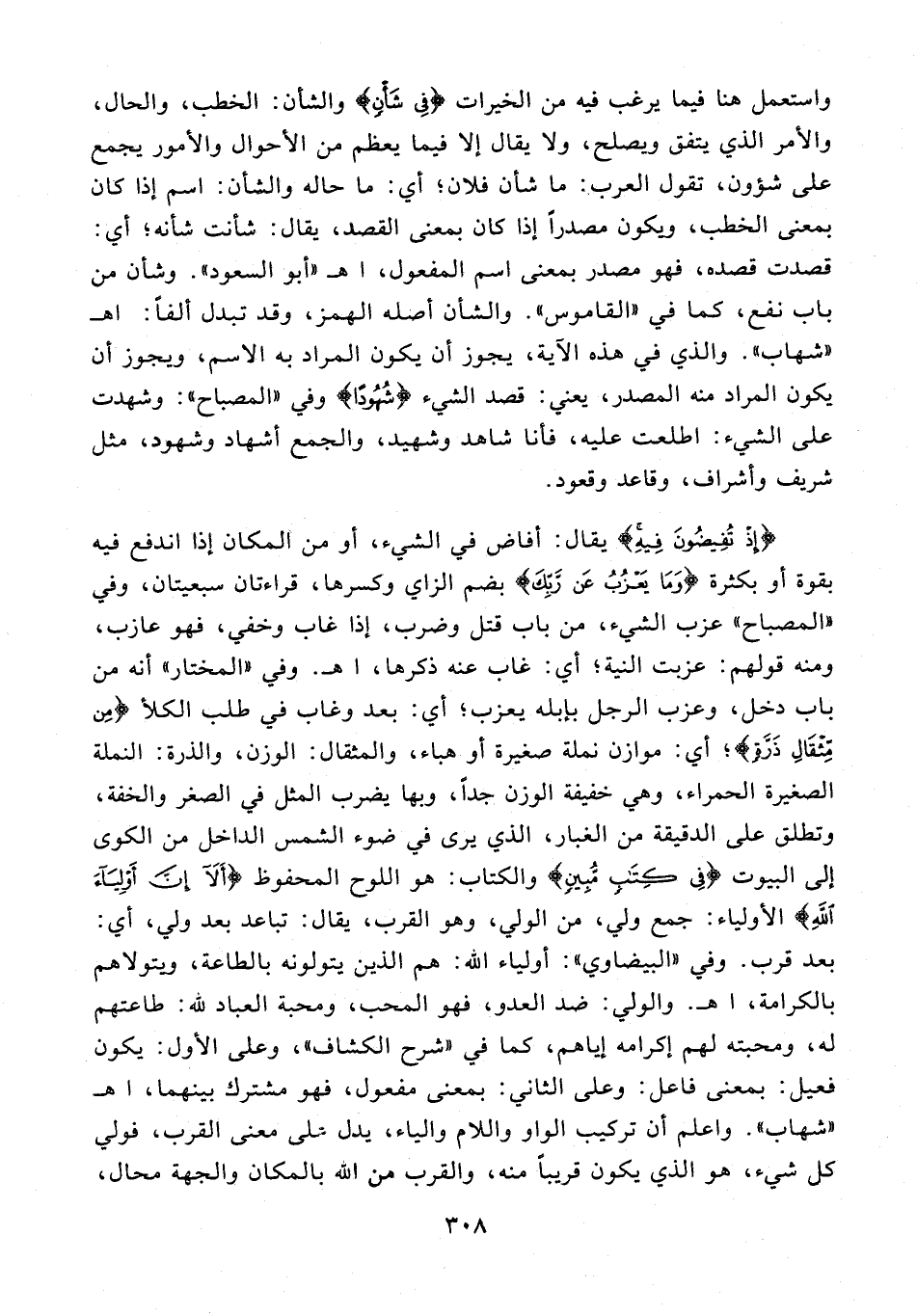 {إِذْ تُفِيضُونَ فِيهِ} يقال: أفاض في الشيء، أو من المكان إذا اندفع فيه بقوة أو بكثرة {وَمَا يَعْزُبُ عَنْ رَبِّكَ} بضم الزاي وكسرها، قراءتان سبعيتان، وفي "المصباح" عزب الشيء، من باب قتل وضرب، إذا غاب وخفي، فهو عازب، ومنه قولهم: عزبت النية؛ أي: غاب عنه ذكرها، اهـ. وفي "المختار" أنه من باب دخل، وعزب الرجل بإبله يعزب؛ أي: بعد وغاب في طلب الكلأ {مِنْ مِثْقَالِ ذَرَّةٍ}؛ أي: موازن نملة صغيرة أو هباء، والمثقال: الوزن، والذرة: النملة الصغيرة الحمراء، وهي خفيفة الوزن جدًّا، وبها يضرب المثل في الصغر والخفة، وتطلق على الدقيقة من الغبار، الذي يرى في ضوء الشمس الداخل من الكوى إلى البيوت {فِي كِتَابٍ مُبِينٍ} والكتاب: هو اللوح المحفوظ {أَلَا إِنَّ أَوْلِيَاءَ اللَّهِ} الأولياء: جمع ولي، من الولي، وهو القرب، يقال: تباعد بعد ولي، أي: بعد قرب. وفي "البيضاوي": أولياء الله: هم الذين يتولونه بالطاعة، ويتولاهم بالكرامة، اهـ. والولي: ضد العدو، فهو المحب، ومحبة العباد لله: طاعتهم له، ومحبته لهم إكرامه إياهم، كما في "شرح الكشاف"، وعلى الأول: يكون فعيل: بمعنى فاعل: وعلى الثاني: بمعنى مفعول، فهو مشترك بينهما، اهـ "شهاب". واعلم أن تركيب الواو واللام والياء، يدل على معنى القرب، فولي كل شيء، هو الذي يكون قريبًا منه، والقرب من الله بالمكان والجهة محال،