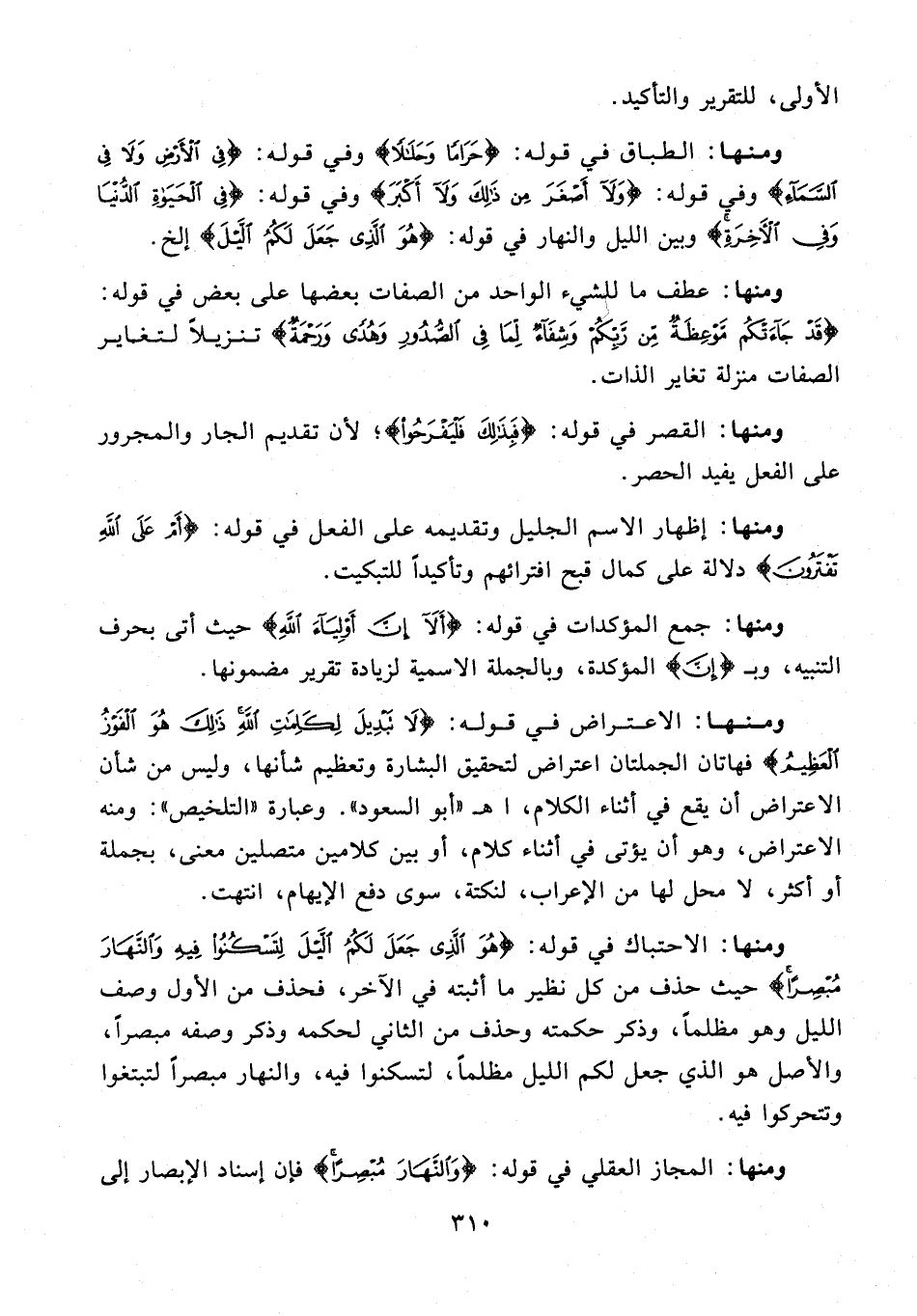 ومنها: الاحتباك في قوله: {هُوَ الَّذِي جَعَلَ لَكُمُ اللَّيْلَ لِتَسْكُنُوا فِيهِ وَالنَّهَارَ مُبْصِرًا} حيث حذف من كل نظير ما أثبته في الآخر، فحذف من الأول وصف الليل وهو مظلمًا، وذكر حكمته وحذف من الثاني لحكمه وذكر وصفه مبصرًا، والأصل هو الذي جعل لكم الليل مظلمًا، لتسكنوا فيه، والنهار مبصرًا لتبتغوا وتتحركوا فيه.