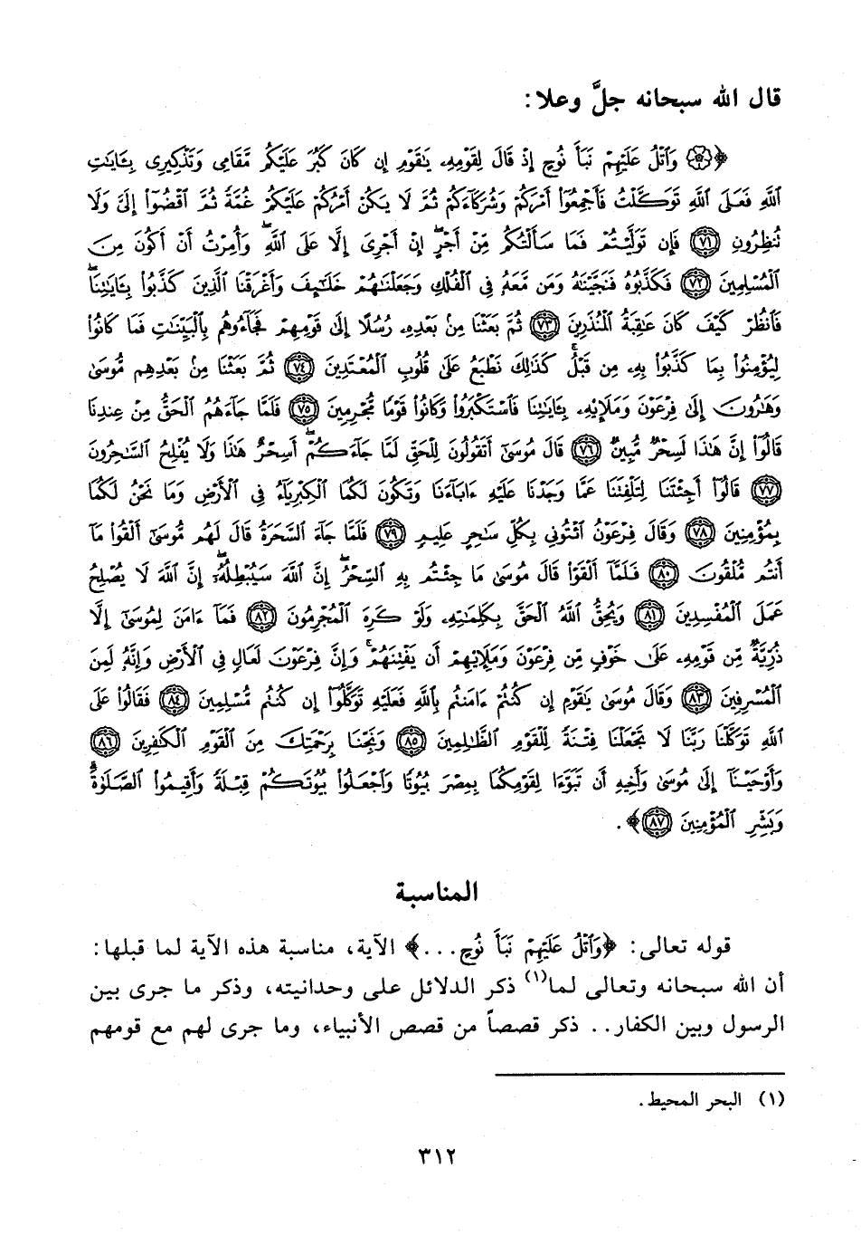 {وَاتْلُ عَلَيْهِمْ نَبَأَ نُوحٍ إِذْ قَالَ لِقَوْمِهِ يَا قَوْمِ إِنْ كَانَ كَبُرَ عَلَيْكُمْ مَقَامِي وَتَذْكِيرِي بِآيَاتِ اللَّهِ فَعَلَى اللَّهِ تَوَكَّلْتُ فَأَجْمِعُوا أَمْرَكُمْ وَشُرَكَاءَكُمْ ثُمَّ لَا يَكُنْ أَمْرُكُمْ عَلَيْكُمْ غُمَّةً ثُمَّ اقْضُوا إِلَيَّ وَلَا تُنْظِرُونِ (71) فَإِنْ تَوَلَّيْتُمْ فَمَا سَأَلْتُكُمْ مِنْ أَجْرٍ إِنْ أَجْرِيَ إِلَّا عَلَى اللَّهِ وَأُمِرْتُ أَنْ أَكُونَ مِنَ الْمُسْلِمِينَ (72) فَكَذَّبُوهُ فَنَجَّيْنَاهُ وَمَنْ مَعَهُ فِي الْفُلْكِ وَجَعَلْنَاهُمْ خَلَائِفَ وَأَغْرَقْنَا الَّذِينَ كَذَّبُوا بِآيَاتِنَا فَانْظُرْ كَيْفَ كَانَ عَاقِبَةُ الْمُنْذَرِينَ (73) ثُمَّ بَعَثْنَا مِنْ بَعْدِهِ رُسُلًا إِلَى قَوْمِهِمْ فَجَاءُوهُمْ بِالْبَيِّنَاتِ فَمَا كَانُوا لِيُؤْمِنُوا بِمَا كَذَّبُوا بِهِ مِنْ قَبْلُ كَذَلِكَ نَطْبَعُ عَلَى قُلُوبِ الْمُعْتَدِينَ (74) ثُمَّ بَعَثْنَا مِنْ بَعْدِهِمْ مُوسَى وَهَارُونَ إِلَى فِرْعَوْنَ وَمَلَئِهِ بِآيَاتِنَا فَاسْتَكْبَرُوا وَكَانُوا قَوْمًا مُجْرِمِينَ (75) فَلَمَّا جَاءَهُمُ الْحَقُّ مِنْ عِنْدِنَا قَالُوا إِنَّ هَذَا لَسِحْرٌ مُبِينٌ (76) قَالَ مُوسَى أَتَقُولُونَ لِلْحَقِّ لَمَّا جَاءَكُمْ أَسِحْرٌ هَذَا وَلَا يُفْلِحُ السَّاحِرُونَ (77) قَالُوا أَجِئْتَنَا لِتَلْفِتَنَا عَمَّا وَجَدْنَا عَلَيْهِ آبَاءَنَا وَتَكُونَ لَكُمَا الْكِبْرِيَاءُ فِي الْأَرْضِ وَمَا نَحْنُ لَكُمَا بِمُؤْمِنِينَ (78) وَقَالَ فِرْعَوْنُ ائْتُونِي بِكُلِّ سَاحِرٍ عَلِيمٍ (79) فَلَمَّا جَاءَ السَّحَرَةُ قَالَ لَهُمْ مُوسَى أَلْقُوا مَا أَنْتُمْ مُلْقُونَ (80) فَلَمَّا أَلْقَوْا قَالَ مُوسَى مَا جِئْتُمْ بِهِ السِّحْرُ إِنَّ اللَّهَ سَيُبْطِلُهُ إِنَّ اللَّهَ لَا يُصْلِحُ عَمَلَ الْمُفْسِدِينَ (81) وَيُحِقُّ اللَّهُ الْحَقَّ بِكَلِمَاتِهِ وَلَوْ كَرِهَ الْمُجْرِمُونَ (82) فَمَا آمَنَ لِمُوسَى إِلَّا ذُرِّيَّةٌ مِنْ قَوْمِهِ عَلَى خَوْفٍ مِنْ فِرْعَوْنَ وَمَلَئِهِمْ أَنْ يَفْتِنَهُمْ وَإِنَّ فِرْعَوْنَ لَعَالٍ فِي الْأَرْضِ وَإِنَّهُ لَمِنَ الْمُسْرِفِينَ (83) وَقَالَ مُوسَى يَا قَوْمِ إِنْ كُنْتُمْ آمَنْتُمْ بِاللَّهِ فَعَلَيْهِ تَوَكَّلُوا إِنْ كُنْتُمْ مُسْلِمِينَ (84) فَقَالُوا عَلَى اللَّهِ تَوَكَّلْنَا رَبَّنَا لَا تَجْعَلْنَا فِتْنَةً لِلْقَوْمِ الظَّالِمِينَ (85) وَنَجِّنَا بِرَحْمَتِكَ مِنَ الْقَوْمِ الْكَافِرِينَ (86) وَأَوْحَيْنَا إِلَى مُوسَى وَأَخِيهِ أَنْ تَبَوَّآ لِقَوْمِكُمَا بِمِصْرَ بُيُوتًا وَاجْعَلُوا بُيُوتَكُمْ قِبْلَةً وَأَقِيمُوا الصَّلَاةَ وَبَشِّرِ الْمُؤْمِنِينَ (87)}.