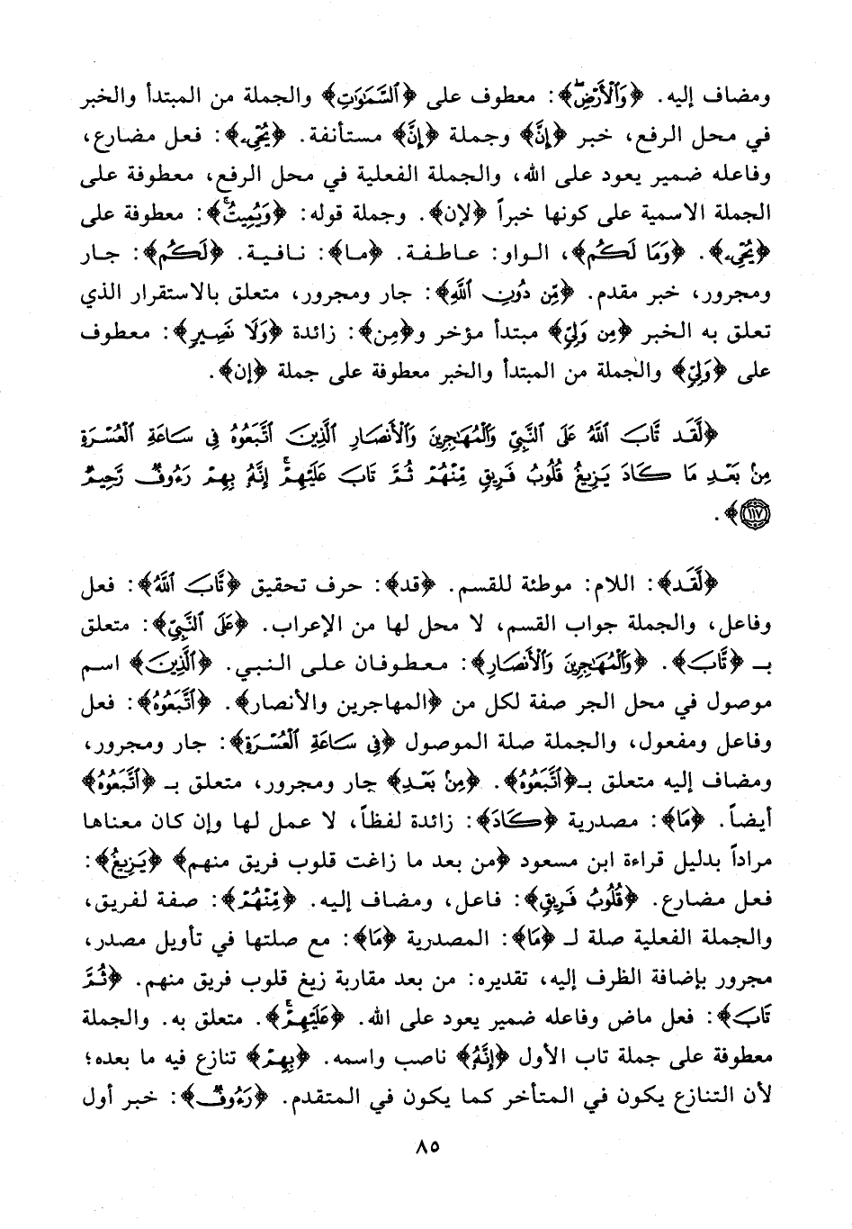 {لَقَدْ}: اللام: موطئة للقسم. {قد}: حرف تحقيق {تَابَ اللَّهُ}: فعل وفاعل، والجملة جواب القسم، لا محل لها من الإعراب. {عَلَى النَّبِيِّ}: متعلق بـ {تَابَ}. {وَالْمُهَاجِرِينَ وَالْأَنْصَارِ}: معطوفان على النبي. {الَّذِينَ} اسم موصول في محل الجر صفة لكل من {الْمُهَاجِرِينَ وَالْأَنْصَارِ}. {اتَّبَعُوهُ}: فعل وفاعل ومفعول، والجملة صلة الموصول {فِي سَاعَةِ الْعُسْرَةِ}: جار ومجرور، ومضاف إليه متعلق بـ {اتَّبَعُوهُ}. {مِنْ بَعْدِ} جار ومجرور، متعلق بـ {اتَّبَعُوهُ} أيضًا. {مَا}: مصدرية {كَادَ}: زائدة لفظًا، لا عمل لها وإن كان معناها مرادًا بدليل قراءة ابن مسعود {من بعد ما زاغت قلوب فريق منهم} {يَزِيغُ}: فعل مضارع. {قُلُوبُ فَرِيقٍ}: فاعل، ومضاف إليه. {مِنْهُمْ}: صفة لفريق، والجملة الفعلية صلة لـ {مَا}: المصدرية {مَا}: مع صلتها في تأويل مصدر، مجرور بإضافة الظرف إليه، تقديره: من بعد مقاربة زيغ قلوب فريق منهم. {ثُمَّ تَابَ}: فعل ماض وفاعله ضمير يعود على الله. {عَلَيْهِمْ} متعلق به. والجملة معطوفة على جملة تاب الأول {إِنَّهُ} ناصب واسمه. {بِهِمْ} تنازع فيه ما بعده؛ لأن التنازع يكون في المتأخر كما يكون في المتقدم. {رَءُوفٌ}: خبر أول