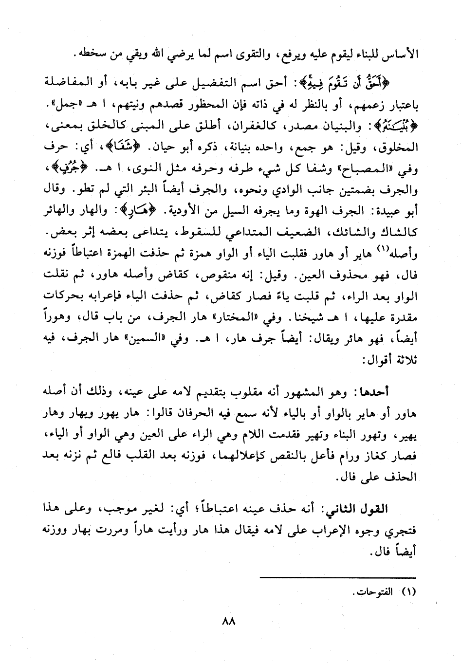 القول الثاني: أنه حذف عينه اعتباطًا؛ أي: لغير موجب، وعلى هذا فتجري وجوه الإعراب على لامه فيقال هذا هار ورأيت هارًا ومررت بهار ووزنه أيضًا قال.