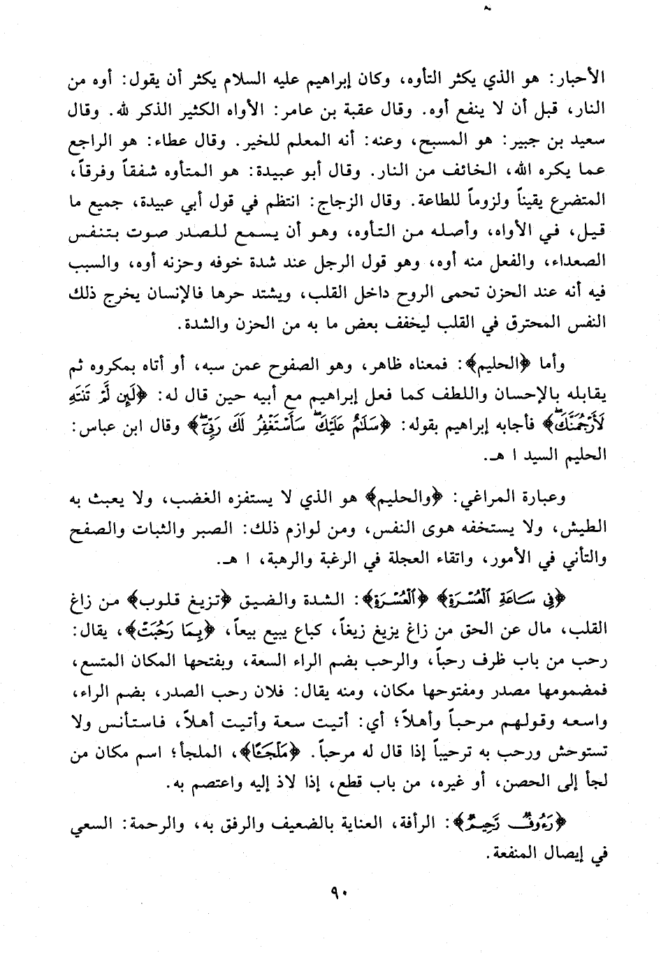 الأحبار: هو الذي يكثر التأوه، وكان إبراهيم عليه السلام يكثر أن يقول: أوه من النار، قبل أن لا ينفع أوه. وقال عقبة بن عامر: الأواه الكثير الذكر لله. وقال سعيد بن جبير: هو المسبح، وعنه: أنه المعلم للخير. وقال عطاء: هو الراجع عما يكره الله، الخائف من النار. وقال أبو عبيدة: هو المتأوه شفقًا وفرقًا، المتضرع يقينًا ولزومًا للطاعة. وقال الزجاج: انتظم في قول أبي عبيدة، جميع ما قيل، في الأواه، وأصله من التأوه، وهو أن يسمع للصدر صوت بتنفس الصعداء، والفعل منه أوه، وهو قول الرجل عند شدة خوفه وحزنه أوه، والسبب فيه أنه عند الحزن تحمى الروح داخل القلب، ويشتد حرها فالإنسان يخرج ذلك النفس المحترق في القلب ليخفف بعض ما به من الحزن والشدة.