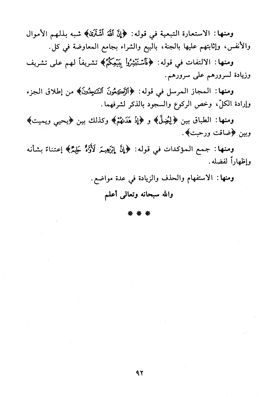 ومنها: الاستعارة التبعية في قوله: {إِنَّ اللَّهَ اشْتَرَى} {فَاسْتَبْشِرُوا بِبَيْعِكُمُ} شبه بذلهم الأموال والأنفس، وإثابتهم عليها بالجنة، بالبيع والشراء بجامع المعاوضة في كل.