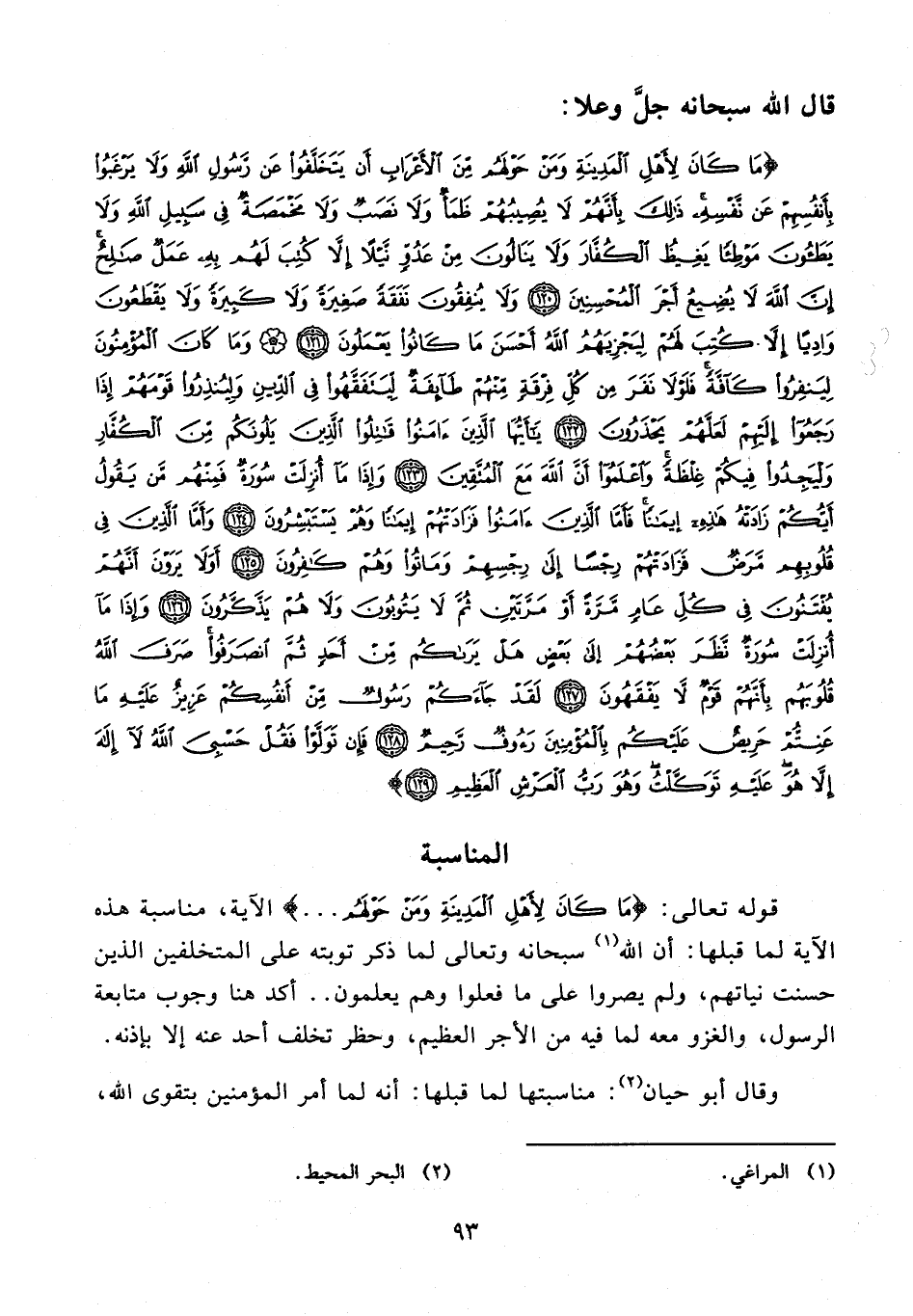 {مَا كَانَ لِأَهْلِ الْمَدِينَةِ وَمَنْ حَوْلَهُمْ مِنَ الْأَعْرَابِ أَنْ يَتَخَلَّفُوا عَنْ رَسُولِ اللَّهِ وَلَا يَرْغَبُوا بِأَنْفُسِهِمْ عَنْ نَفْسِهِ ذَلِكَ بِأَنَّهُمْ لَا يُصِيبُهُمْ ظَمَأٌ وَلَا نَصَبٌ وَلَا مَخْمَصَةٌ فِي سَبِيلِ اللَّهِ وَلَا يَطَئُونَ مَوْطِئًا يَغِيظُ الْكُفَّارَ وَلَا يَنَالُونَ مِنْ عَدُوٍّ نَيْلًا إِلَّا كُتِبَ لَهُمْ بِهِ عَمَلٌ صَالِحٌ إِنَّ اللَّهَ لَا يُضِيعُ أَجْرَ الْمُحْسِنِينَ (120) وَلَا يُنْفِقُونَ نَفَقَةً صَغِيرَةً وَلَا كَبِيرَةً وَلَا يَقْطَعُونَ وَادِيًا إِلَّا كُتِبَ لَهُمْ لِيَجْزِيَهُمُ اللَّهُ أَحْسَنَ مَا كَانُوا يَعْمَلُونَ (121) وَمَا كَانَ الْمُؤْمِنُونَ لِيَنْفِرُوا كَافَّةً فَلَوْلَا نَفَرَ مِنْ كُلِّ فِرْقَةٍ مِنْهُمْ طَائِفَةٌ لِيَتَفَقَّهُوا فِي الدِّينِ وَلِيُنْذِرُوا قَوْمَهُمْ إِذَا رَجَعُوا إِلَيْهِمْ لَعَلَّهُمْ يَحْذَرُونَ (122) يَا أَيُّهَا الَّذِينَ آمَنُوا قَاتِلُوا الَّذِينَ يَلُونَكُمْ مِنَ الْكُفَّارِ وَلْيَجِدُوا فِيكُمْ غِلْظَةً وَاعْلَمُوا أَنَّ اللَّهَ مَعَ الْمُتَّقِينَ (123) وَإِذَا مَا أُنْزِلَتْ سُورَةٌ فَمِنْهُمْ مَنْ يَقُولُ أَيُّكُمْ زَادَتْهُ هَذِهِ إِيمَانًا فَأَمَّا الَّذِينَ آمَنُوا فَزَادَتْهُمْ إِيمَانًا وَهُمْ يَسْتَبْشِرُونَ (124) وَأَمَّا الَّذِينَ فِي قُلُوبِهِمْ مَرَضٌ فَزَادَتْهُمْ رِجْسًا إِلَى رِجْسِهِمْ وَمَاتُوا وَهُمْ كَافِرُونَ (125) أَوَلَا يَرَوْنَ أَنَّهُمْ يُفْتَنُونَ فِي كُلِّ عَامٍ مَرَّةً أَوْ مَرَّتَيْنِ ثُمَّ لَا يَتُوبُونَ وَلَا هُمْ يَذَّكَّرُونَ (126) وَإِذَا مَا أُنْزِلَتْ سُورَةٌ نَظَرَ بَعْضُهُمْ إِلَى بَعْضٍ هَلْ يَرَاكُمْ مِنْ أَحَدٍ ثُمَّ انْصَرَفُوا صَرَفَ اللَّهُ قُلُوبَهُمْ بِأَنَّهُمْ قَوْمٌ لَا يَفْقَهُونَ (127) لَقَدْ جَاءَكُمْ رَسُولٌ مِنْ أَنْفُسِكُمْ عَزِيزٌ عَلَيْهِ مَا عَنِتُّمْ حَرِيصٌ عَلَيْكُمْ بِالْمُؤْمِنِينَ رَءُوفٌ رَحِيمٌ (128) فَإِنْ تَوَلَّوْا فَقُلْ حَسْبِيَ اللَّهُ لَا إِلَهَ إِلَّا هُوَ عَلَيْهِ تَوَكَّلْتُ وَهُوَ رَبُّ الْعَرْشِ الْعَظِيمِ (129)}.