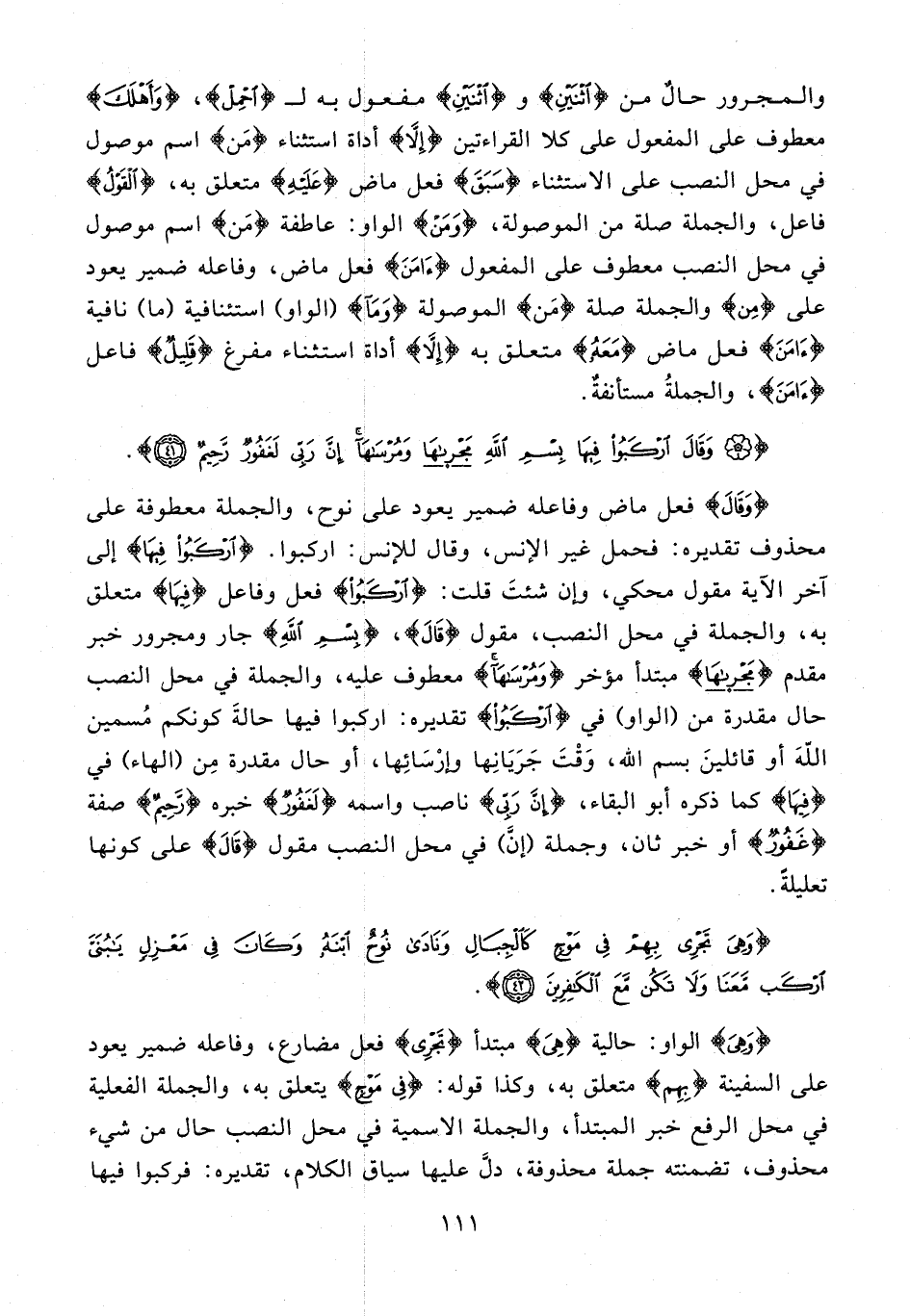 والمجرور حالٌ من {اثْنَيْنِ} و {اثْنَيْنِ} مفعول به لـ {احْمِلْ}، {وَأَهْلَكَ} معطوف على المفعول على كلا القراءتين {إِلَّا} أداة استثناء {مَن} اسم موصول في محل النصب على الاستثناء {سَبَقَ} فعل ماض {عَلَيْهِ} متعلق به، {الْقَوْلُ} فاعل، والجملة صلة من الموصولة، {وَمَنْ} الواو: عاطفة {مَن} اسم موصول في محل النصب معطوف على المفعول {آمَنَ} فعل ماض، وفاعله ضمير يعود على {مِن} والجملة صلة {مَن} الموصولة {وَمَا} (الواو) استئنافية (ما) نافية {آمَنَ} فعل ماض {مَعَهُ} متعلق به {إِلَّا} أداة استثناء مفرغ {قَلِيلٌ} فاعل {آمَنَ}، والجملةُ مستأنفةٌ.