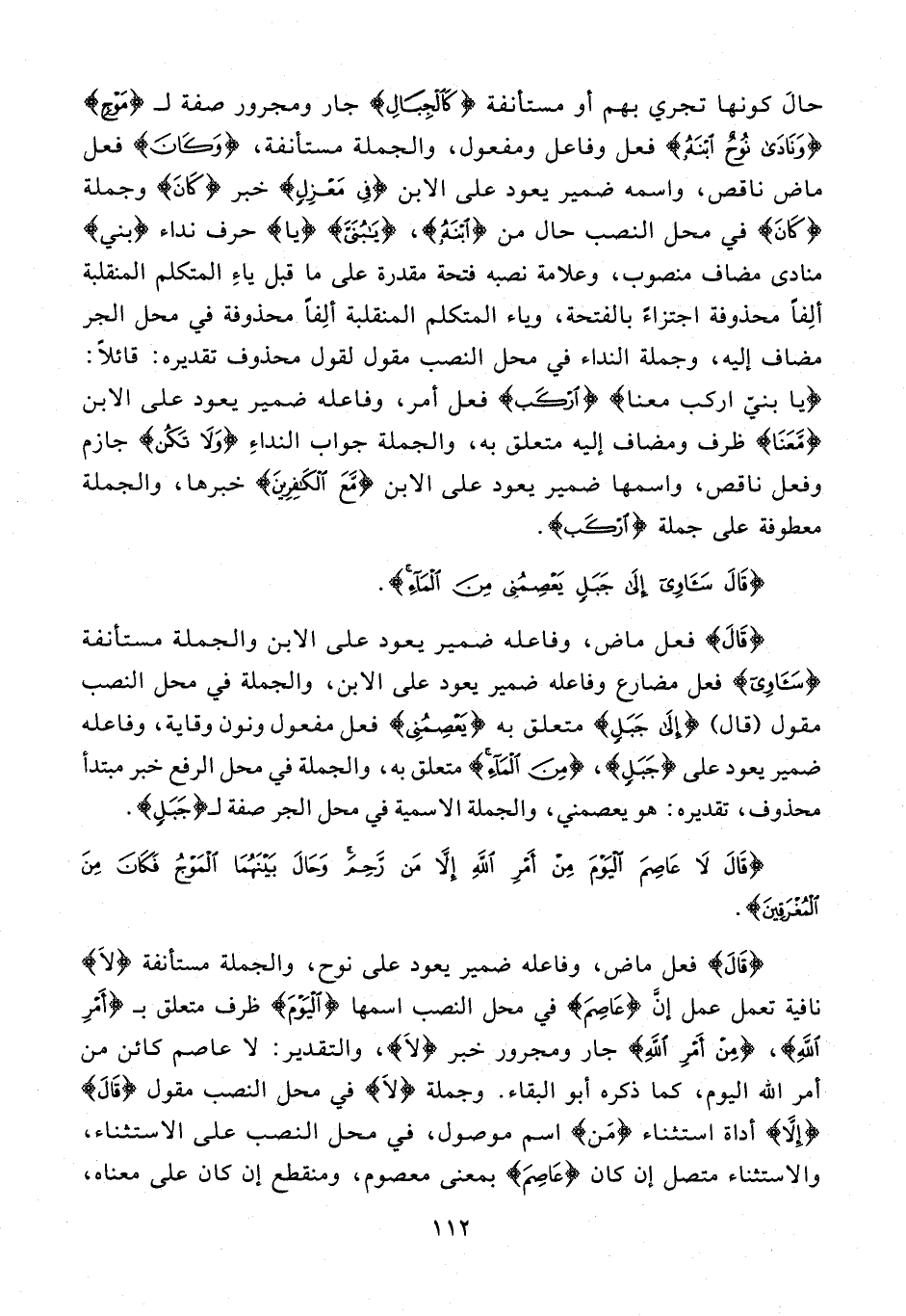 حالَ كونها تجري بهم أو مستأنفة {كَالْجِبَالِ} جار ومجرور صفة لـ {مَوْجٍ} {وَنَادَى نُوحٌ ابْنَهُ} فعل وفاعل ومفعول، والجملة مستأنفة، {وَكَانَ} فعل ماض ناقص، واسمه ضمير يعود على الابن {فِي مَعْزِلٍ} خبر {كَانَ} وجملة {كَانَ} في محل النصب حال من {ابْنَهُ}، {يَا بُنَيَّ} {يا} حرف نداء {بني} منادى مضاف منصوب، وعلامة نصبه فتحة مقدرة على ما قبل ياءِ المتكلم المنقلبة ألِفًا محذوفة اجتزاءً بالفتحة، وياء المتكلم المنقلبة ألِفًا محذوفة في محل الجر مضاف إليه، وجملة النداء في محل النصب مقول لقول محذوف تقديره: قائلًا: {يا بنيّ اركب معنا} {ارْكَبْ} فعل أمر، وفاعله ضمير يعود على الابن {مَعَنَا} ظرف ومضاف إليه متعلق به، والجملة جواب النداءِ {وَلَا تَكُنْ} جازم وفعل ناقص، واسمها ضمير يعود على الابن {مَعَ الْكَافِرِينَ} خبرها، والجملة معطوفة على جملة {ارْكَبْ}.
