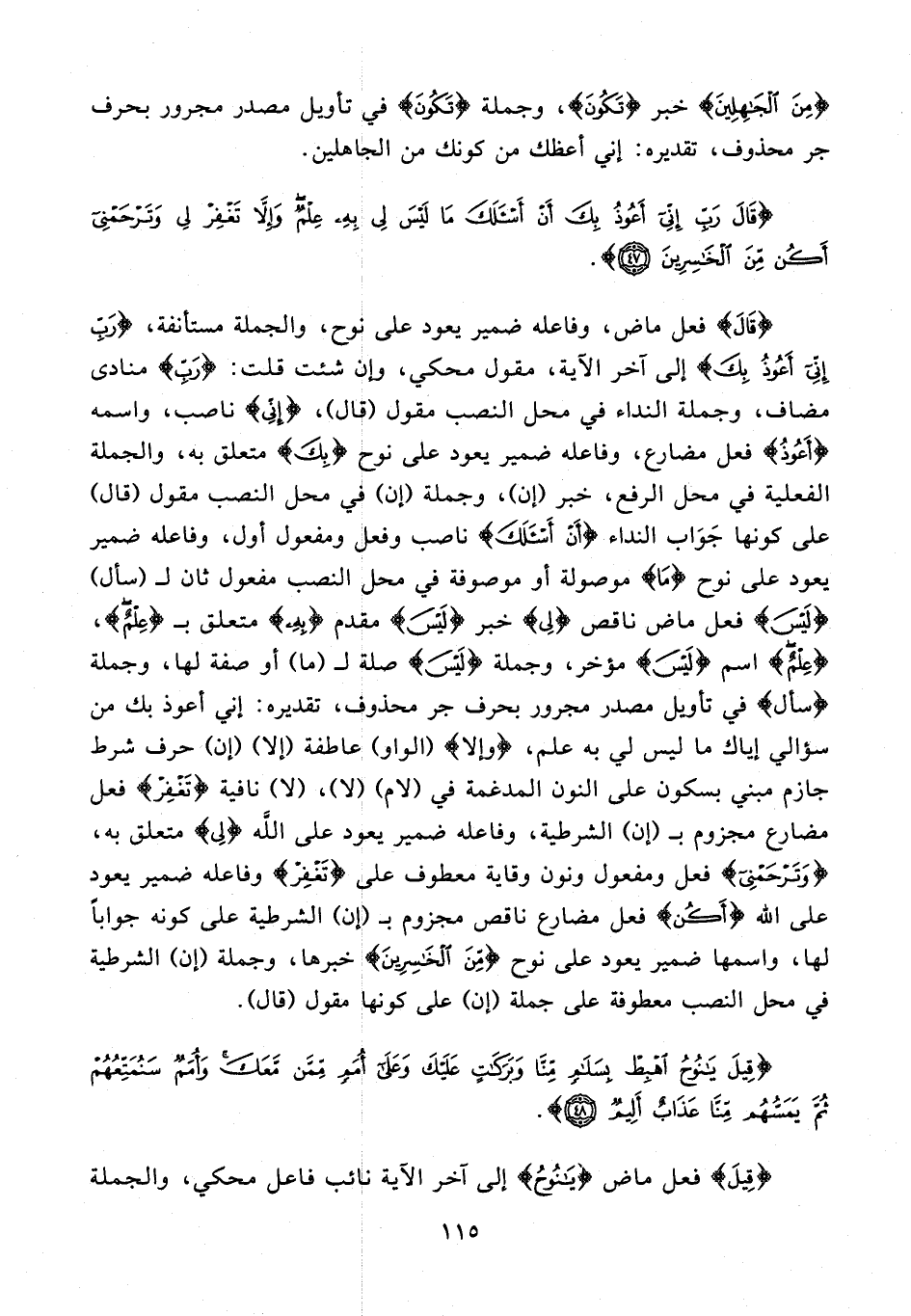 {قَالَ} فعل ماض، وفاعله ضمير يعود على نوح، والجملة مستأنفة، {رَبِّ إِنِّي أَعُوذُ بِكَ} إلى آخر الآية، مقول محكي، وإن شئت قلت: {رَبِّ} منادى مضاف، وجملة النداء في محل النصب مقول (قال)، {إِنِّي} ناصب، واسمه {أَعُوذُ} فعل مضارع، وفاعله ضمير يعود على نوح {بِكَ} متعلق به، والجملة الفعلية في محل الرفع، خبر (إن)، وجملة (إن) في محل النصب مقول (قال) على كونها جَوَاب النداء {أَنْ أَسْأَلَكَ} ناصب وفعل ومفعول أول، وفاعله ضمير يعود على نوح {مَا} موصولة أو موصوفة في محل النصب مفعول ثان لـ (سأل) {لَيْسَ} فعل ماض ناقص {لِي} خبر {لَيْسَ} مقدم {بِهِ} متعلق بـ {عِلْمٌ}، {عِلْمٌ} اسم {لَيْسَ} مؤخر، وجملة {لَيْسَ} صلة لـ (ما) أو صفة لها، وجملة {سأل} في تأويل مصدر مجرور بحرف جر محذوف، تقديره: إني أعوذ بك من سؤالي إياك ما ليس لي به علم، {وإلا} (الواو) عاطفة (إلا) (إن) حرف شرط جازم مبني بسكون على النون المدغمة في (لام) (لا)، (لا) نافية {تَغْفِرْ} فعل مضارع مجزوم بـ (إن) الشرطية، وفاعله ضمير يعود على اللَّه {لِي} متعلق به، {وَتَرْحَمْنِي} فعل ومفعول ونون وقاية معطوف على {تَغْفِرْ} وفاعله ضمير يعود على الله {أَكُنْ} فعل مضارع ناقص مجزوم بـ (إن) الشرطية على كونه جوابًا لها، واسمها ضمير يعود على نوح {مِنَ الْخَاسِرِينَ} خبرها، وجملة (إن) الشرطية في محل النصب معطوفة على جملة (إن) على كونها مقول (قال).