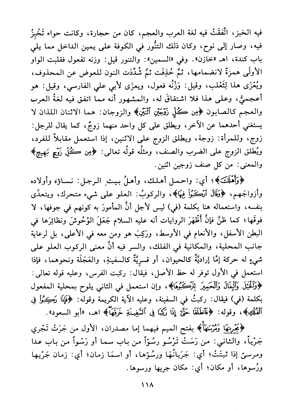 {وَأَهْلَكَ}؛ أي: واحمل أهلك، وأهلُ بيتِ الرجل: نساؤه وأولاده وأزواجَهم، {وَقَالَ ارْكَبُوا فِيهَا}، والركوبُ: العلو على شيء متحرك، ويتعدَّى بنفسه، واستعماله هنا بكلمة (في) ليس لأجل أنَّ المأمورَ به كونهم في جوفها, لا فوقَها؛ كما ظنَّ فإنَّ أَظْهَرَ الروايات أنه عليه السلام جَعَلَ الوُحُوشَ ونظائِرَها في البطن الأسفل، والأنعام في الأوسط, ورَكِبَ هو ومن معه في الأعلى، بل لرعاية جانب المحلية، والمكانية في الفلك، والسر فيه أنَّ معنى الركوب العلو على شيءٍ له حركة إمَّا إراديَّةٌ كالحيوان، أو قسرِيَّةٌ كالسفينةِ، والعَجَلَة ونحوهما، فإذا استعمل في الأول توفر له حظ الأصل، فيقال: ركبت الفرس، وعليه قوله تعالى: {وَالْخَيْلَ وَالْبِغَالَ وَالْحَمِيرَ لِتَرْكَبُوهَا}، وإن استعمل في الثاني يلوح بمحلية المفعول بكلمة (في) فيقال: ركبتُ في السفينة، وعليه الآية الكريمة وقوله: {فَإِذَا رَكِبُوا فِي الْفُلْكِ}، وقوله: {فَانْطَلَقَا حَتَّى إِذَا رَكِبَا فِي السَّفِينَةِ خَرَقَهَا} اهـ، "أبو السعود".