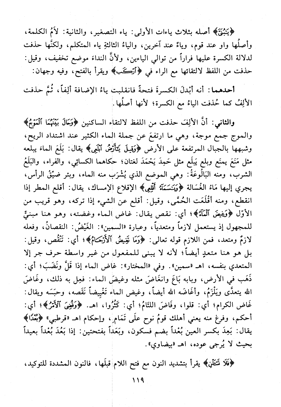 والثاني: أنَّ الألِفَ حذفت من اللفظ لالتقاء الساكنين {وَحَالَ بَيْنَهُمَا الْمَوْجُ} والموج جمع موجة، وهي ما ارتفعَ عن جملة الماء الكثير عند اشتداد الريح، وشبهها بالجبال المرتفعة على الأرض {وَقِيلَ يَا أَرْضُ ابْلَعِي} يقال: بَلَعَ الماءَ يبلعه مثل مَنَعَ يمنَع وبلع يَبلَع مثل حَمِدَ يَحْمَدَ لغتان؛ حكاهما الكسائِي، والفراء، والبَلَعُ الشرب، ومنه البَالُوعَةُ: وهي الموضع الذي يُشْرَب منه الماء، وبئر ضيِّقُ الرأس، يجري إليها مَاءُ الغُسَالة {وَيَا سَمَاءُ أَقْلِعِي} الإقلاع الإمساك، يقال: أقلع المطر إذا انقطع، ومنه أقْلَعَت الحُمَّى، وقيل: أقلع عن الشيء إذا تركه، وهو قريب من الأوّل {وَغِيضَ الْمَاءُ}؛ أي: نقص يقال: غاض الماء وغضته، وهو هنا مبنيٌّ للمجهول إذ يستعمل لازمًا ومتعديًا، وعبارة "السمين": الغَيْضُ: النقصانُ، وفعله لازمٌ ومتعد، فمن اللازم قوله تعالى: {وَمَا تَغِيضُ الْأَرْحَامُ}؛ أي: تَنْقُص، وقيل: بل هو هنا متعدٍ أيضًا؛ لأنه لا يبنى للمفعول من غير واسطة حرف جر إلا المتعدي بنفسه، اهـ "سمين". وفي "المختار": غاض الماء إذا قَلَّ ونَضَبَ؛ أي: ذَهَب في الأرض، وبابه بَاعَ وانغَاضَ مثله وغيضَ الماء: فعِل به ذلك، وغَاضَ الله يتعدَّى وَيلْزَمُ، وأغَاضَه الله أيضًا، وغيض الماء تَغْيِيضًا نَقَصه، وحبَسَه ويقال: غَاض الكرام؛ أي: قلوا، وفَاضَ اللئَامُ؛ أي: كَثُرُوا، اهـ. {وَقُضِيَ الْأَمْرُ}؛ أي: أحكم، وفرغ منه يعني أهلك قومُ نوح علَى تَمَامِ، وإحكام اهـ "قرطبي" {بُعْدًا} يقال: بَعِدَ بكسر العين بُعْدًا بضم فسكون، وبَعَدًا بفتحتين: إذا بَعُدَ بُعْدًا بعيدًا بحيث لا يُرجى عوده، اهـ "بيضاوي".
