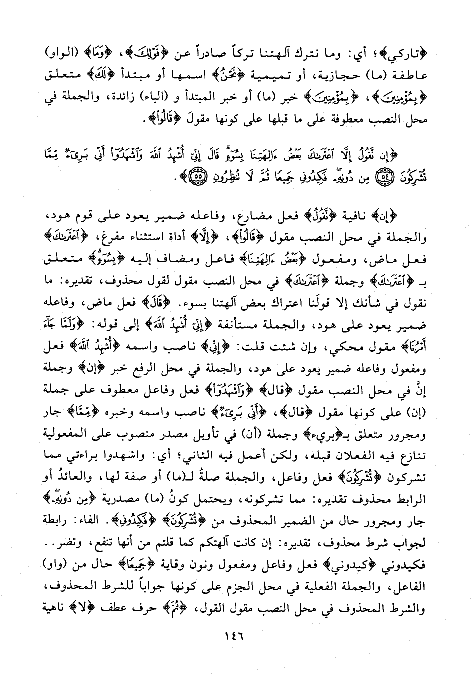 {إن} نافية {نَقُولُ} فعل مضارع، وفاعله ضمير يعود على قوم هود، والجملة في محل النصب مقول {قَالُوا}، {إِلَّا} أداة استثناء مفرغ، {اعْتَرَاكَ} فعل ماض، ومفعول {بَعْضُ آلِهَتِنَا} فاعل ومضاف إليه {بِسُوءٍ} متعلق بـ {اعْتَرَاكَ} وجملة {اعْتَرَاكَ} في محل النصب مقول لقول محذوف، تقديره: ما نقول في شأنك إلا قولَنا اعتراك بعض آلهتنا بسوء. {قَالَ} فعل ماض، وفاعله ضمير يعود على هود، والجملة مستأنفة {إِنِّي أُشْهِدُ اللَّهَ} إلى قوله: {وَلَمَّا جَاءَ أَمْرُنَا} مقول محكي، وإن شئت قلت: {إِنِّي} ناصب واسمه {أُشْهِدُ اللَّهَ} فعل ومفعول وفاعله ضمير يعود على هود، والجملة في محل الرفع خبر {إن} وجملة إنَّ في محل النصب مقول {قال} {وَاشْهَدُوا} فعل وفاعل معطوف على جملة (إن) على كونها مقول {قال}، {أَنِّي بَرِيءٌ} ناصب واسمه وخبره {مِمَّا} جار ومجرور متعلق بـ {بريء} وجملة (أن) في تأويل مصدر منصوب على المفعولية تنازع فيه الفعلان قبله، ولكن أعمل فيه الثاني؛ أي: واشهدوا براءتي مما تشركون {تُشْرِكُونَ} فعل وفاعل، والجملة صلةُ لـ (ما) أو صفة لها، والعائدُ أو الرابط محذوف تقديره: مما تشركونه، ويحتمل كونُ (ما) مصدرية {مِنْ دُونِهِ} جار ومجرور حال من الضمير المحذوف من {تُشْرِكُونَ} {فَكِيدُونِي}. الفاء: رابطة لجواب شرط محذوف، تقديره: إن كانت آلهتكم كما قلتم من أنها تنفع، وتضر .. فكيدوني {كيدوني} فعل وفاعل ومفعول ونون وقاية {جَمِيعًا} حال من (واو) الفاعل، والجملة الفعلية في محل الجزم على كونها جوابًا للشرط المحذوف، والشرط المحذوف في محل النصب مقول القول، {ثُمَّ} حرف عطف {لا} ناهية