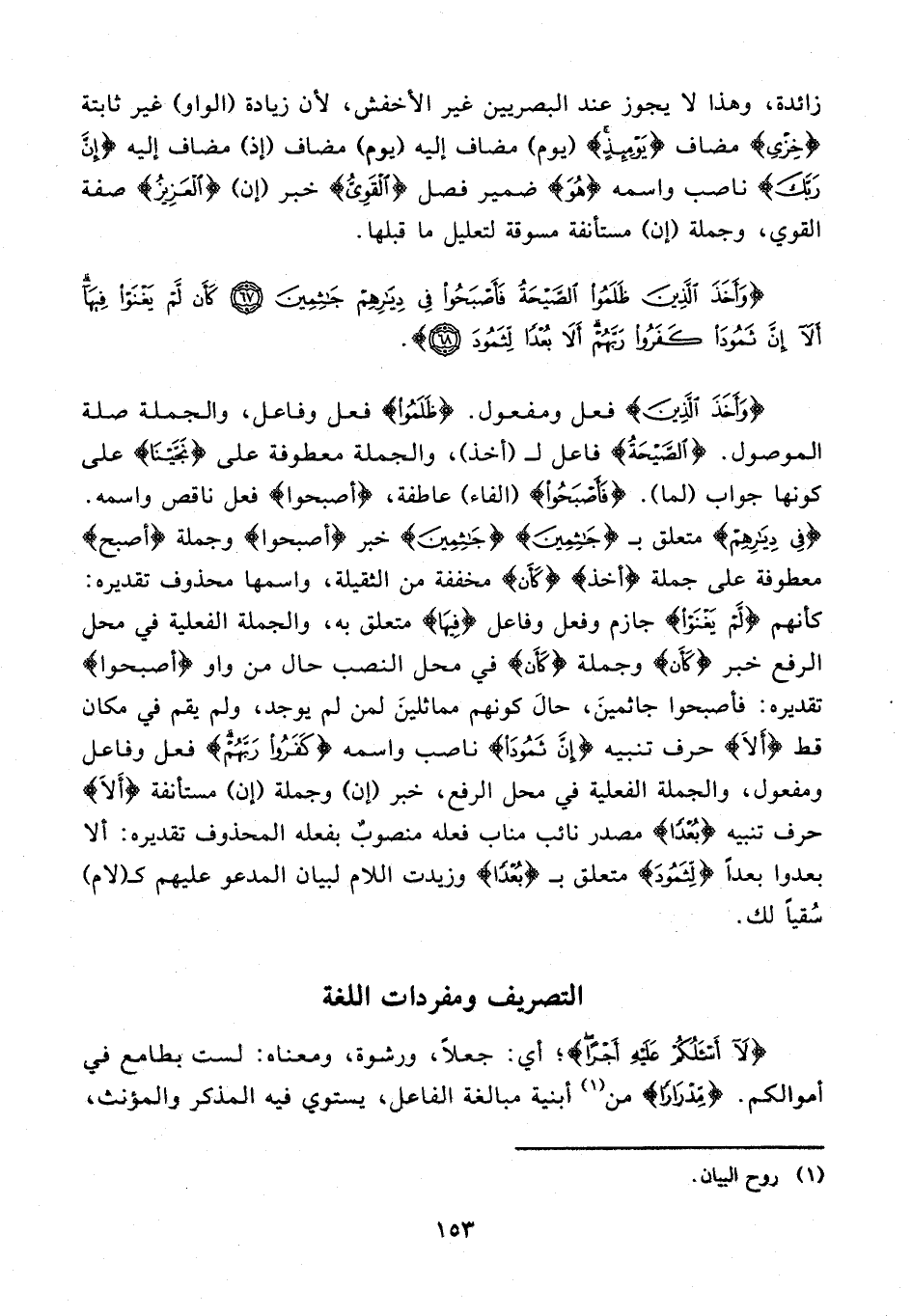 {وَأَخَذَ الَّذِينَ} فعل ومفعول. {ظَلَمُوا} فعل وفاعل، والجملة صلة الموصول. {الصَّيْحَةُ} فاعل لـ (أخذ)، والجملة معطوفة على {نَجَّيْنَا} على كونها جواب (لما). {فَأَصْبَحُوا} (الفاء) عاطفة، {أصبحوا} فعل ناقص واسمه. {فِي دِيَارِهِمْ} متعلق بـ {جَاثِمِينَ} {جَاثِمِينَ} خبر {أصبحوا} وجملة {أصبح} معطوفة على جملة {أخذ} {كَأَنْ} مخففة من الثقيلة، واسمها محذوف تقديره: كأنهم {لَمْ يَغْنَوْا} جازم وفعل وفاعل {فِيهَا} متعلق به، والجملة الفعلية في محل الرفع خبر {كَأَنْ} وجملة {كَأَنْ} في محل النصب حال من واو {أصبحوا} تقديره: فأصبحوا جاثمينَ، حالَ كونهم مماثلينَ لمن لم يوجد، ولم يقم في مكان قط {أَلَا} حرف تنبيه {إِنَّ ثَمُودَ} ناصب واسمه {كَفَرُوا رَبَّهُمْ} فعل وفاعل ومفعول، والجملة الفعلية في محل الرفع، خبر (إن) وجملة (إن) مستأنفة {أَلَا} حرف تنبيه {بُعْدًا} مصدر نائب مناب فعله منصوبٌ بفعله المحذوف تقديره: ألا بعدوا بعدًا {لِثَمُودَ} متعلق بـ {بُعْدًا} وزيدت اللام لبيان المدعو عليهم كـ (لام) سُقيًا لك.