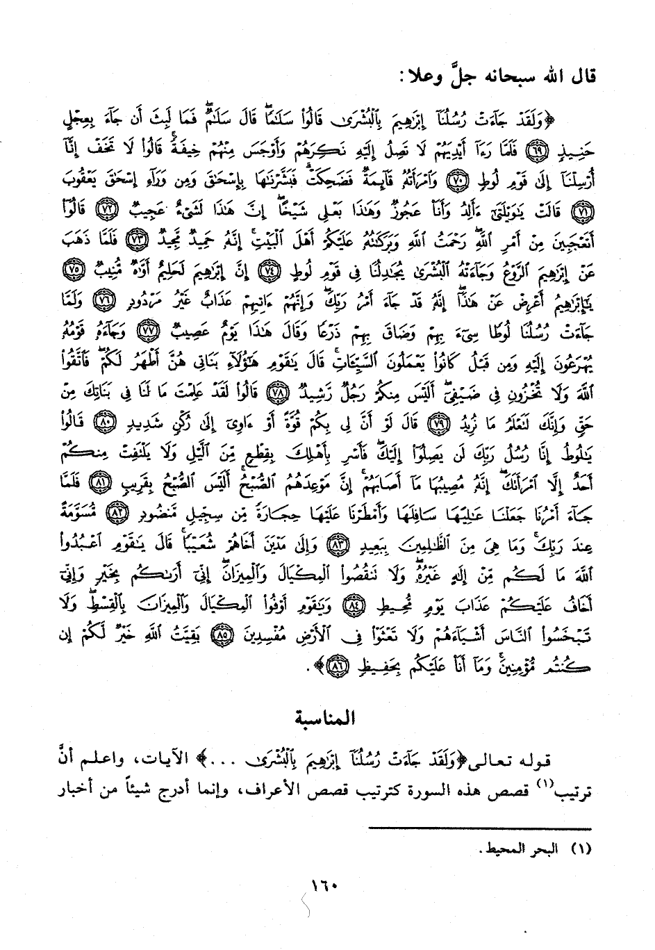 {وَلَقَدْ جَاءَتْ رُسُلُنَا إِبْرَاهِيمَ بِالْبُشْرَى قَالُوا سَلَامًا قَالَ سَلَامٌ فَمَا لَبِثَ أَنْ جَاءَ بِعِجْلٍ حَنِيذٍ (69) فَلَمَّا رَأَى أَيْدِيَهُمْ لَا تَصِلُ إِلَيْهِ نَكِرَهُمْ وَأَوْجَسَ مِنْهُمْ خِيفَةً قَالُوا لَا تَخَفْ إِنَّا أُرْسِلْنَا إِلَى قَوْمِ لُوطٍ (70) وَامْرَأَتُهُ قَائِمَةٌ فَضَحِكَتْ فَبَشَّرْنَاهَا بِإِسْحَاقَ وَمِنْ وَرَاءِ إِسْحَاقَ يَعْقُوبَ (71) قَالَتْ يَا وَيْلَتَى أَأَلِدُ وَأَنَا عَجُوزٌ وَهَذَا بَعْلِي شَيْخًا إِنَّ هَذَا لَشَيْءٌ عَجِيبٌ (72) قَالُوا أَتَعْجَبِينَ مِنْ أَمْرِ اللَّهِ رَحْمَتُ اللَّهِ وَبَرَكَاتُهُ عَلَيْكُمْ أَهْلَ الْبَيْتِ إِنَّهُ حَمِيدٌ مَجِيدٌ (73) فَلَمَّا ذَهَبَ عَنْ إِبْرَاهِيمَ الرَّوْعُ وَجَاءَتْهُ الْبُشْرَى يُجَادِلُنَا فِي قَوْمِ لُوطٍ (74) إِنَّ إِبْرَاهِيمَ لَحَلِيمٌ أَوَّاهٌ مُنِيبٌ (75) يَا إِبْرَاهِيمُ أَعْرِضْ عَنْ هَذَا إِنَّهُ قَدْ جَاءَ أَمْرُ رَبِّكَ وَإِنَّهُمْ آتِيهِمْ عَذَابٌ غَيْرُ مَرْدُودٍ (76) وَلَمَّا جَاءَتْ رُسُلُنَا لُوطًا سِيءَ بِهِمْ وَضَاقَ بِهِمْ ذَرْعًا وَقَالَ هَذَا يَوْمٌ عَصِيبٌ (77) وَجَاءَهُ قَوْمُهُ يُهْرَعُونَ إِلَيْهِ وَمِنْ قَبْلُ كَانُوا يَعْمَلُونَ السَّيِّئَاتِ قَالَ يَا قَوْمِ هَؤُلَاءِ بَنَاتِي هُنَّ أَطْهَرُ لَكُمْ فَاتَّقُوا اللَّهَ وَلَا تُخْزُونِ فِي ضَيْفِي أَلَيْسَ مِنْكُمْ رَجُلٌ رَشِيدٌ (78) قَالُوا لَقَدْ عَلِمْتَ مَا لَنَا فِي بَنَاتِكَ مِنْ حَقٍّ وَإِنَّكَ لَتَعْلَمُ مَا نُرِيدُ (79) قَالَ لَوْ أَنَّ لِي بِكُمْ قُوَّةً أَوْ آوِي إِلَى رُكْنٍ شَدِيدٍ (80) قَالُوا يَا لُوطُ إِنَّا رُسُلُ رَبِّكَ لَنْ يَصِلُوا إِلَيْكَ فَأَسْرِ بِأَهْلِكَ بِقِطْعٍ مِنَ اللَّيْلِ وَلَا يَلْتَفِتْ مِنْكُمْ أَحَدٌ إِلَّا امْرَأَتَكَ إِنَّهُ مُصِيبُهَا مَا أَصَابَهُمْ إِنَّ مَوْعِدَهُمُ الصُّبْحُ أَلَيْسَ الصُّبْحُ بِقَرِيبٍ (81) فَلَمَّا جَاءَ أَمْرُنَا جَعَلْنَا عَالِيَهَا سَافِلَهَا وَأَمْطَرْنَا عَلَيْهَا حِجَارَةً مِنْ سِجِّيلٍ مَنْضُودٍ (82) مُسَوَّمَةً عِنْدَ رَبِّكَ وَمَا هِيَ مِنَ الظَّالِمِينَ بِبَعِيدٍ (83) وَإِلَى مَدْيَنَ أَخَاهُمْ شُعَيْبًا قَالَ يَا قَوْمِ اعْبُدُوا اللَّهَ مَا لَكُمْ مِنْ إِلَهٍ غَيْرُهُ وَلَا تَنْقُصُوا الْمِكْيَالَ وَالْمِيزَانَ إِنِّي أَرَاكُمْ بِخَيْرٍ وَإِنِّي أَخَافُ عَلَيْكُمْ عَذَابَ يَوْمٍ مُحِيطٍ (84) وَيَا قَوْمِ أَوْفُوا الْمِكْيَالَ وَالْمِيزَانَ بِالْقِسْطِ وَلَا تَبْخَسُوا النَّاسَ أَشْيَاءَهُمْ وَلَا تَعْثَوْا فِي الْأَرْضِ مُفْسِدِينَ (85) بَقِيَّتُ اللَّهِ خَيْرٌ لَكُمْ إِنْ كُنْتُمْ مُؤْمِنِينَ وَمَا أَنَا عَلَيْكُمْ بِحَفِيظٍ (86)}.