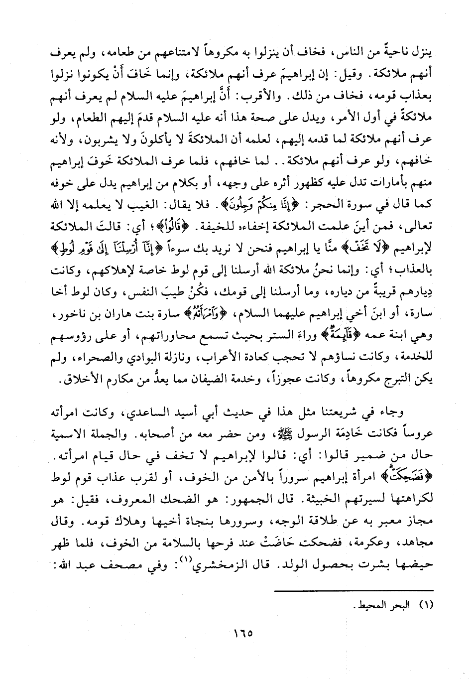 وجاء في شريعتنا مثل هذا في حديث أبي أسيد الساعدي، وكانت امرأته عروسًا فكانت خَادِمَة الرسول - صلى الله عليه وسلم -، ومن حضر معه من أصحابه. والجملة الاسمية حال من ضمير قالوا: أي: قالوا لإبراهيم لا تخف في حال قيام امرأته. {فَضَحِكَتْ} امرأة إبراهيم سرورًا بالأمن من الخوف، أو لقرب عذاب قوم لوط لكراهتها لسيرتهم الخبيثة. قال الجمهور: هو الضحك المعروف، فقيل: هو مجاز معبر به عن طلاقة الوجه، وسرورها بنجاة أخيها وهلاك قومه. وقال مجاهد، وعكرمة، فضحكت، حَاضَتْ عند فرحها بالسلامة من الخوف، فلما ظهر حيضها بشرت بحصول الولد. قال الزمخشري (¬1): وفي مصحف عبد الله: