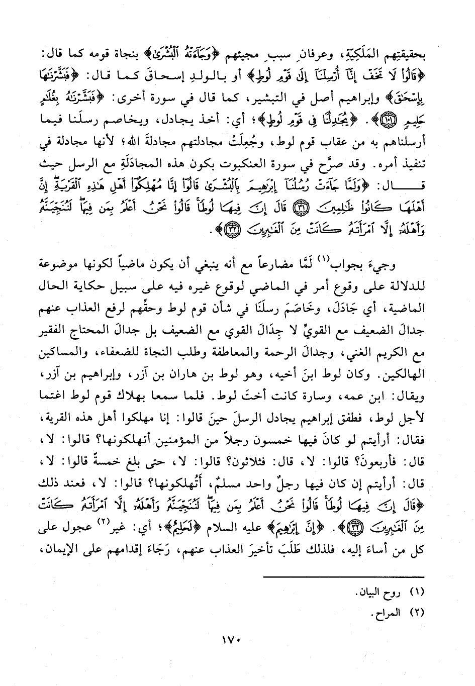 بحقيقتِهم المَلَكِيّةِ، وعرفانِ سببِ مجيئهم {وَجَاءَتْهُ الْبُشْرَى} بنجاة قومه كما قال: {قَالُوا لَا تَخَفْ إِنَّا أُرْسِلْنَا إِلَى قَوْمِ لُوطٍ} أو بالولدِ إسحاقَ كما قال: {فَبَشَّرْنَاهَا بِإِسْحَاقَ} وإبراهيم أصل في التبشير، كما قال في سورة أخرى: {فَبَشَّرْنَاهُ بِغُلَامٍ حَلِيمٍ (101)}. {يُجَادِلُنَا فِي قَوْمِ لُوطٍ}؛ أي: أخذ يجادل، ويخاصم رسلَنا فيما أرسلناهم به من عقاب قوم لوط، وجُعِلَتْ مجادلتهم مجادلةَ الله؛ لأنها مجادلة في تنفيذ أمره. وقد صرَّح في سورة العنكبوت بكون هذه المجادَلَةِ مع الرسل حيث قال: {وَلَمَّا جَاءَتْ رُسُلُنَا إِبْرَاهِيمَ بِالْبُشْرَى قَالُوا إِنَّا مُهْلِكُو أَهْلِ هَذِهِ الْقَرْيَةِ إِنَّ أَهْلَهَا كَانُوا ظَالِمِينَ (31) قَالَ إِنَّ فِيهَا لُوطًا قَالُوا نَحْنُ أَعْلَمُ بِمَنْ فِيهَا لَنُنَجِّيَنَّهُ وَأَهْلَهُ إِلَّا امْرَأَتَهُ كَانَتْ مِنَ الْغَابِرِينَ (32)}.