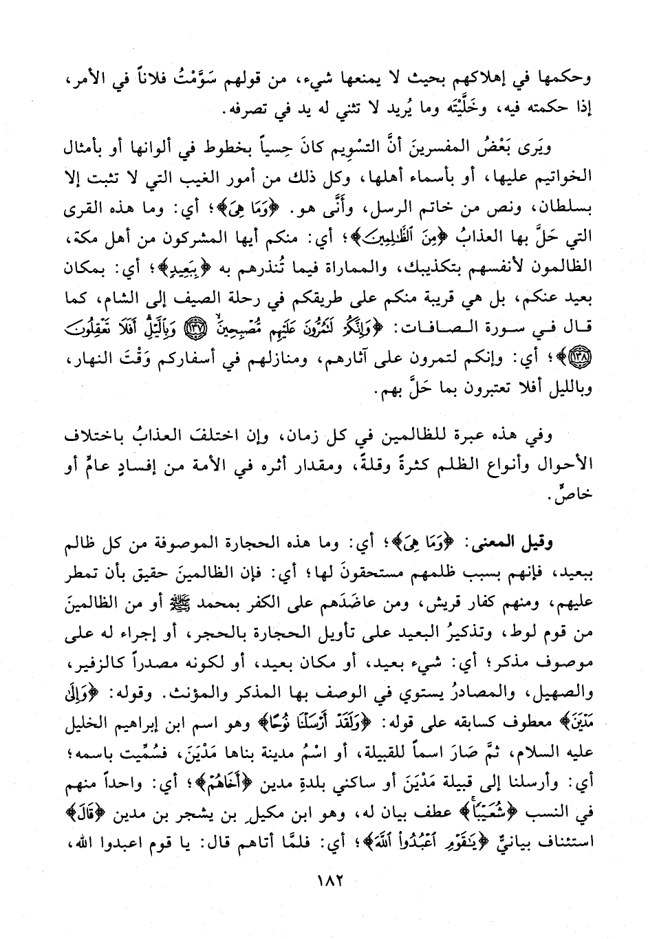 ويَرى بَعْضُ المفسرينَ أنَّ التسْوِيم كانَ حِسيًّا بخطوط في ألوانها أو بأمثال الخواتيم عليها، أو بأسماء أهلها، وكل ذلك من أمور الغيب التي لا تثبت إلا بسلطان، ونص من خاتم الرسل، وأَنَّى هو. {وَمَا هِيَ}؛ أي: وما هذه القرى التي حَلَّ بها العذابُ {مِنَ الظَّالِمِينَ}؛ أي: منكم أيها المشركون من أهل مكة، الظالمون لأنفسهم بتكذيبك، والمماراة فيما تُنذرهم به {بِبَعِيدٍ}؛ أي: بمكان بعيد عنكم، بل هي قريبة منكم على طريقكم في رحلة الصيف إلى الشام، كما قال في سورة الصافات: {وَإِنَّكُمْ لَتَمُرُّونَ عَلَيْهِمْ مُصْبِحِينَ (137) وَبِاللَّيْلِ أَفَلَا تَعْقِلُونَ (138)}؛ أي: وإنكم لتمرون على آثارهم، ومنازلهم في أسفاركم وَقْتَ النهار، وبالليل أفلا تعتبرون بما حَلَّ بهم.