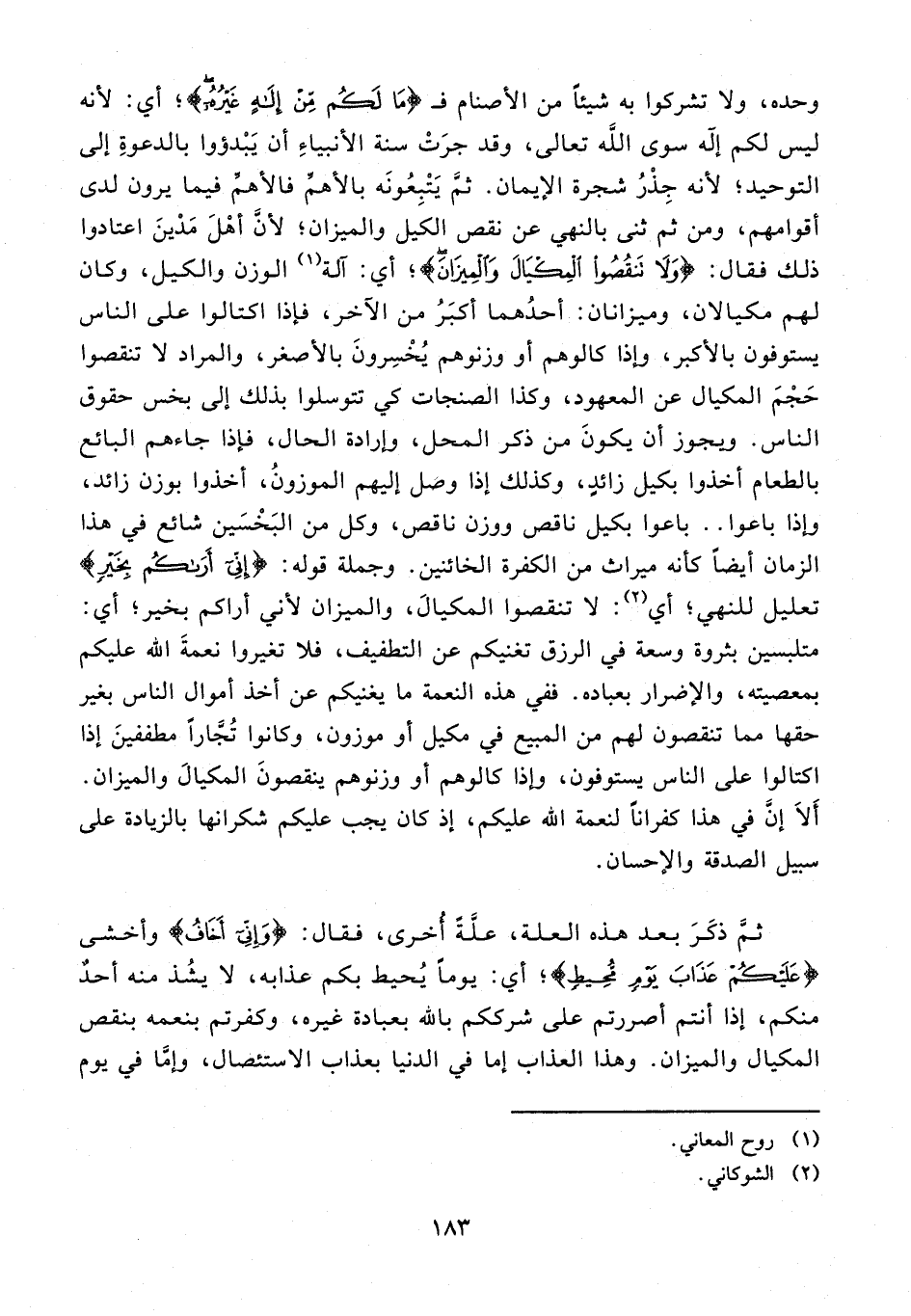 وحده، ولا تشركوا به شيئًا من الأصنام فـ {مَا لَكُمْ مِنْ إِلَهٍ غَيْرُهُ}؛ أي: لأنه ليس لكم إله سوى اللَّه تعالى، وقد جرَتْ سنة الأنبياءِ أن يَبْدؤوا بالدعوةِ إلى التوحيد؛ لأنه جِذْرُ شجرة الإيمان. ثمَّ يَتْبِعُونَه بالأهمِّ فالأهمِّ فيما يرون لدى أقوامهم، ومن ثم ثنى بالنهي عن نقص الكيل والميزان؛ لأنَّ أهْلَ مَدْينَ اعتادوا ذلك فقال: {وَلَا تَنْقُصُوا الْمِكْيَالَ وَالْمِيزَانَ}؛ أي: آلة (¬1) الوزن والكيل، وكان لهم مكيالان، وميزانان: أحدُهما أكبَرُ من الآخر، فإذا اكتالوا على الناس يستوفون بالأكبر، وإذا كالوهم أو وزنوهم يُخْسِرونَ بالأصغر، والمراد لا تنقصوا حَجْمَ المكيال عن المعهود، وكذا الصنجات كي تتوسلوا بذلك إلى بخس حقوق الناس. ويجوز أن يكونَ من ذكر المحل، وإرادة الحال، فإذا جاءهم البائع بالطعام أخذوا بكيل زائدٍ، وكذلك إذا وصل إليهم الموزونُ، أخذوا بوزن زائد، وإذا باعوا .. باعوا بكيل ناقص ووزن ناقص، وكل من البَخْسَين شائع في هذا الزمان أيضًا كأنه ميراث من الكفرة الخائنين. وجملة قوله: {إِنِّي أَرَاكُمْ بِخَيْرٍ} تعليل للنهي؛ أي (¬2): لا تنقصوا المكيالَ، والميزان لأني أراكم بخير؛ أي: متلبسين بثروة وسعة في الرزق تغنيكم عن التطفيف، فلا تغيروا نعمةَ الله عليكم بمعصيته، والإضرار بعباده. ففي هذه النعمة ما يغنيكم عن أخذ أموال الناس بغير حقها مما تنقصون لهم من المبيع في مكيل أو موزون، وكانوا تُجَّارًا مطففينَ إذا اكتالوا على الناس يستوفون، وإذا كالوهم أو وزنوهم ينقصونَ المكيالَ والميزان. أَلاَ إنَّ في هذا كفرانًا لنعمة الله عليكم، إذ كان يجب عليكم شكرانها بالزيادة على سبيل الصدقة والإحسان.