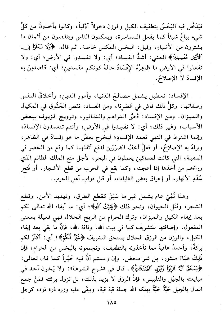 فيَدْخُل فيه البَخْسُ بتطفيف الكيل والوزن دخولًا أوَّليًّا، وكانوا يأخذونَ من كلِّ شيء يباعُ شيئًا كما يفعل السماسرة، ويمكنون الناس وينقصون من أثمان ما يشترون من الأشياءِ، وقيل: البخس المكس خاصة. ثم قال: {وَلَا تَعْثَوْا فِي الْأَرْضِ مُفْسِدِينَ} العثي: أشدُّ الفساد؛ أي: ولا تفسدوا في الأرض؛ أي: ولا تفعلوا في الأرض ما ظاهِرُهُ الإِفْسَادُ حالةَ كونكم مفسدين؛ أي: قاصدينَ به الإفسادَ لا الإصلاحَ.