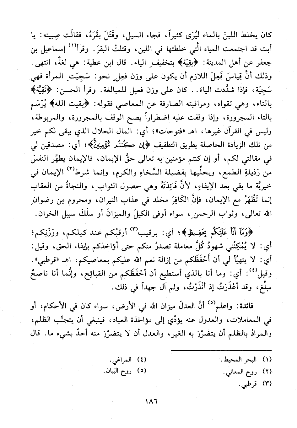 كان يخلط اللبنَ بالماء ليُرَى كثيرًا، فجاء السيل، وقَتَلَ بقَرَهُ، فقالَت صِبيته: يا أبت قد اجتمعت المياه الَّتي خلطتها في اللبن، وقتلتْ البقرَ. وقرأ (¬1) إسماعيل بن جعفر عن أهل المدينة: {بَقِيَّةٍ} بتخفيفِ الياء. قال ابن عطية: هي لغةٌ، انتهى. وذلك أنَّ قِياسَ فَعِلَ اللازم أن يكون على وزن فعِلٍ نحو: سَجِيَتِ المرأة فهي سَجِيَة، فإذا شدَّدت الياءَ .. كان على وزن فعيل للمبالغة. وقرأ الحسن: {تَقِيَّة} بالتاء، وهي تقواه، ومراقبته الصارفة عن المعاصي فقوله: {بقيت الله} يُرْسَم بالتاء المجرورة، وإذا وقفت عليه اضطرارًا يصح الوقف بالمجرورة، والمربوطة، وليس في القرآن غيرها، اهـ "فتوحات"؛ أي: المال الحلال الذي يبقى لكم خير من تلك الزيادة الحاصلة بطريق التطفيف {إِنْ كُنْتُمْ مُؤْمِنِينَ}؛ أي: مصدقين لي في مقالتي لكم، أو إن كنتم مؤمنين به تعالى حقَّ الإيمان, فالإيمان يطهِّر النفسَ من رَذيلةِ الطمع، ويحلِّيها بفضيلة السَّخاءِ والكرم، وإنما شرط (¬2) الإيمان في خيريَّة ما بقي بعد الإيفاءِ, لأنَّ فَائِدَتَهُ وهي حصول الثوابِ، والنجاةُ من العقاب إنما تَظْهَرُ مع الإيمان, فإنَّ الكَافِرَ مخلد في عذاب النيران، ومحروم مِن رضوانِ الله تعالى، وثواب الرحمنِ، سواء أوفى الكيلَ والميزانَ أو سلَكَ سبيل الخوان.