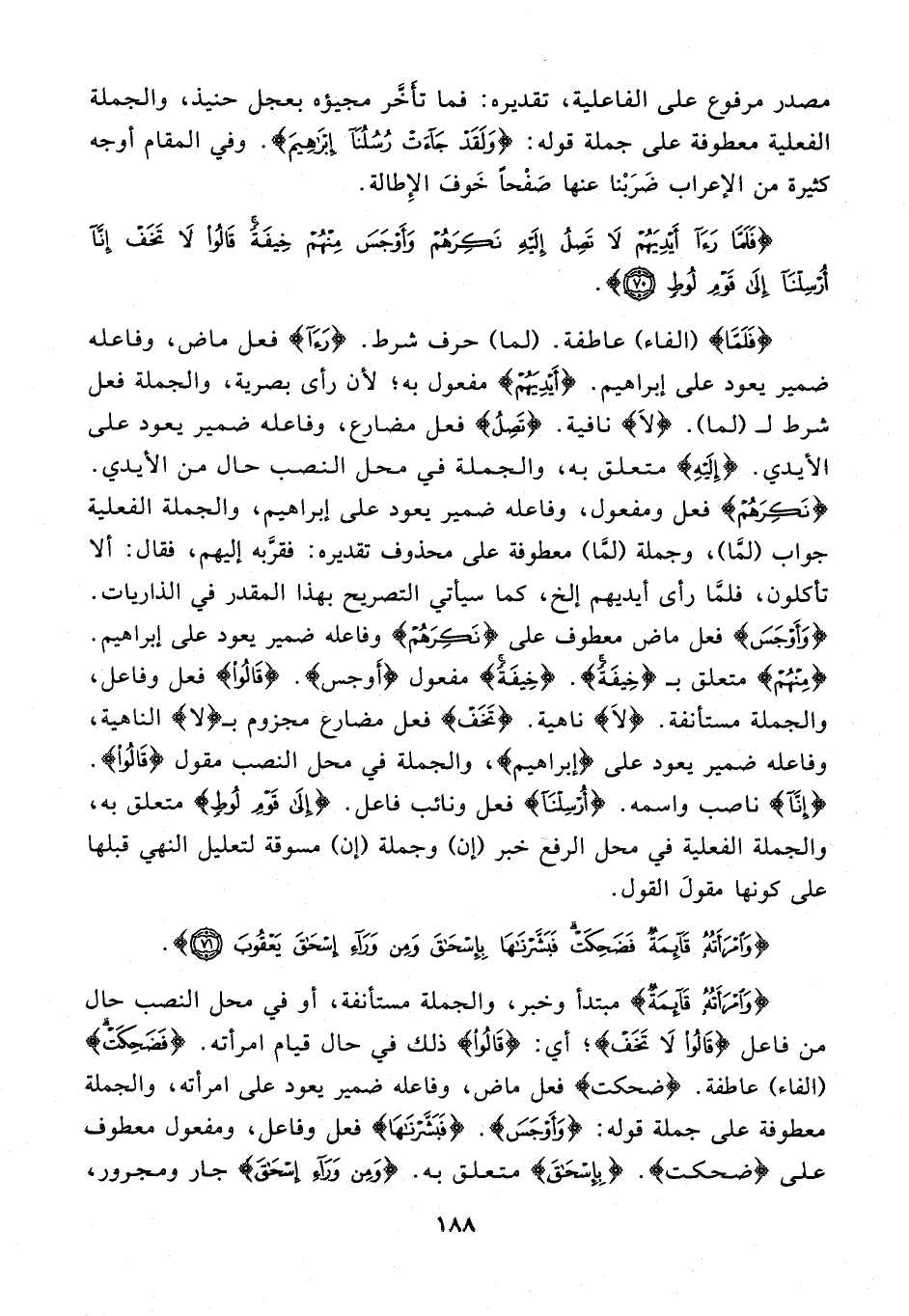 {فَلَمَّا} (الفاء) عاطفة. (لما) حرف شرط. {رَأَى} فعل ماض، وفاعله ضمير يعود على إبراهيم. {أَيْدِيَهُمْ} مفعول به؛ لأن رأى بصرية، والجملة فعل شرط لـ (لما). {لَا} نافية. {تَصِلُ} فعل مضارع، وفاعله ضمير يعود على الأيدي. {إِلَيْهِ} متعلق به، والجملة في محل النصب حال من الأيدي. {نَكِرَهُمْ} فعل ومفعول، وفاعله ضمير يعود على إبراهيم، والجملة الفعلية جواب (لمَّا)، وجملة (لمَّا) معطوفة على محذوف تقديره: فقرَّبه إليهم، فقال: ألا تأكلون، فلمَّا رأى أيديهم إلخ، كما سيأتي التصريح بهذا المقدر في الذاريات. {وَأَوْجَسَ} فعل ماض معطوف على {نَكِرَهُمْ} وفاعله ضمير يعود على إبراهيم. {مِنْهُمْ} متعلق بـ {خِيفَةً}. {خِيفَةً} مفعول {أَوجس}. {قَالُوا} فعل وفاعل، والجملة مستأنفة. {لَا} ناهية. {تَخَفْ} فعل مضارع مجزوم بـ {لا} الناهية، وفاعله ضمير يعود على {إبراهيم}، والجملة في محل النصب مقول {قَالُوا}. {إِنَّا} ناصب واسمه. {أُرْسِلْنَا} فعل ونائب فاعل. {إِلَى قَوْمِ لُوطٍ} متعلق به، والجملة الفعلية في محل الرفع خبر (إن) وجملة (إن) مسوقة لتعليل النهي قبلها على كونها مقولَ القول.
