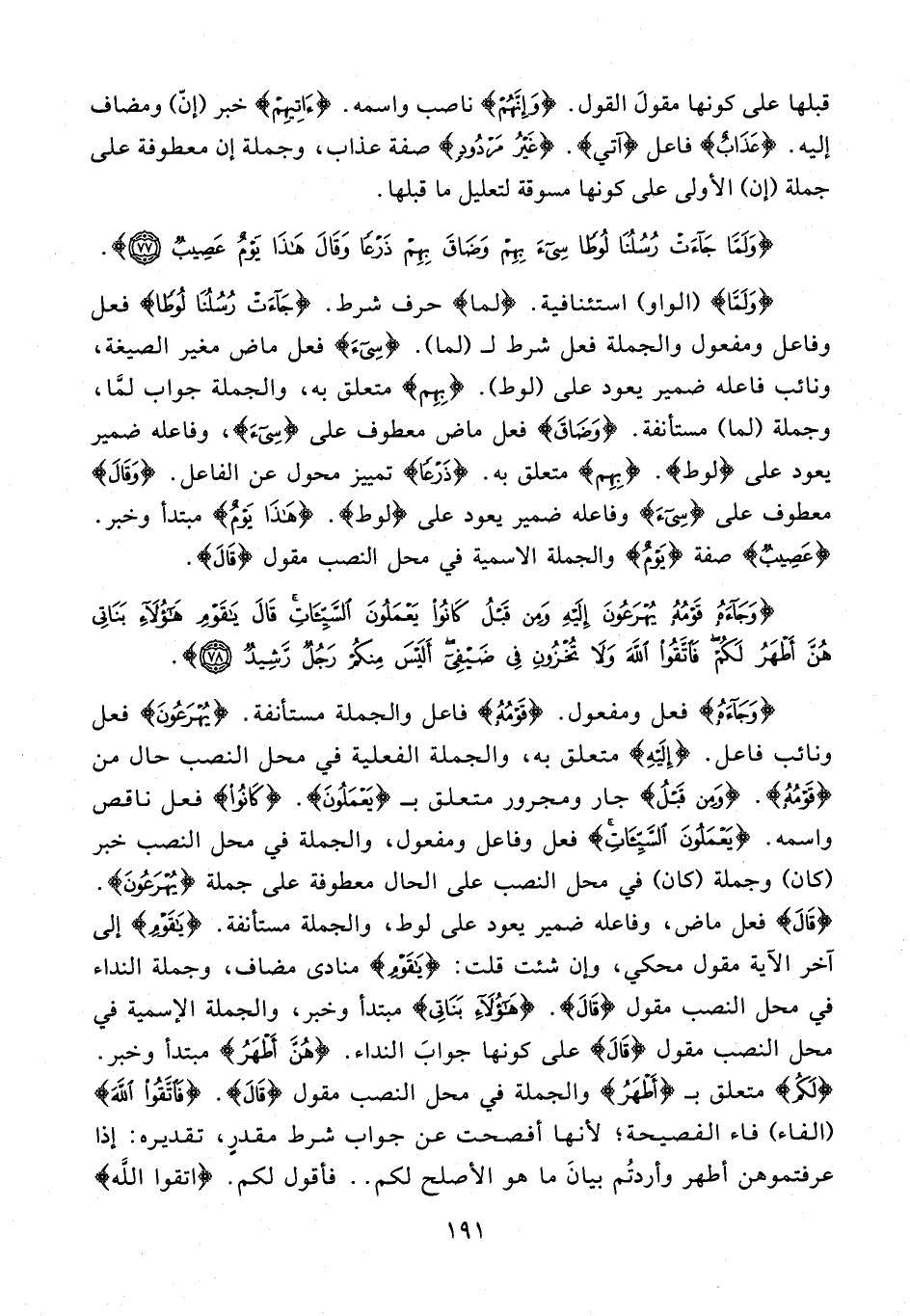{وَجَاءَهُ} فعل ومفعول. {قَوْمُهُ} فاعل والجملة مستأنفة. {يُهْرَعُونَ} فعل ونائب فاعل. {إِلَيْهِ} متعلق به، والجملة الفعلية في محل النصب حال من {قَوْمُهُ}. {وَمِنْ قَبْلُ} جار ومجرور متعلق بـ {يَعْمَلُونَ}. {كَانُوا} فعل ناقص واسمه. {يَعْمَلُونَ السَّيِّئَاتِ} فعل وفاعل ومفعول، والجملة في محل النصب خبر (كان) وجملة (كان) في محل النصب على الحال معطوفة على جملة {يُهْرَعُونَ}. {قَالَ} فعل ماض، وفاعله ضمير يعود على لوط، والجملة مستأنفة. {يَا قَوْمِ} إلى آخر الآية مقول محكي، وإن شئت قلت: {يَا قَوْمِ} منادى مضاف، وجملة النداء في محل النصب مقول {قَالَ}. {هَؤُلَاءِ بَنَاتِي} مبتدأ وخبر، والجملة الإسمية في محل النصب مقول {قَالَ} على كونها جوابَ النداء. {هُنَّ أَطْهَرُ} مبتدأ وخبر. {لَكُمْ} متعلق بـ {أَطْهَرُ} والجملة في محل النصب مقول {قَالَ}. {فَاتَّقُوا اللَّهَ} (الفاء) فاء الفصيحة؛ لأنها أفصحت عن جواب شرط مقدرٍ، تقديره: إذا عرفتموهن أطهر وأردتُم بيانَ ما هو الأصلح لكم .. فأقول لكم. {اتقوا اللَّه}