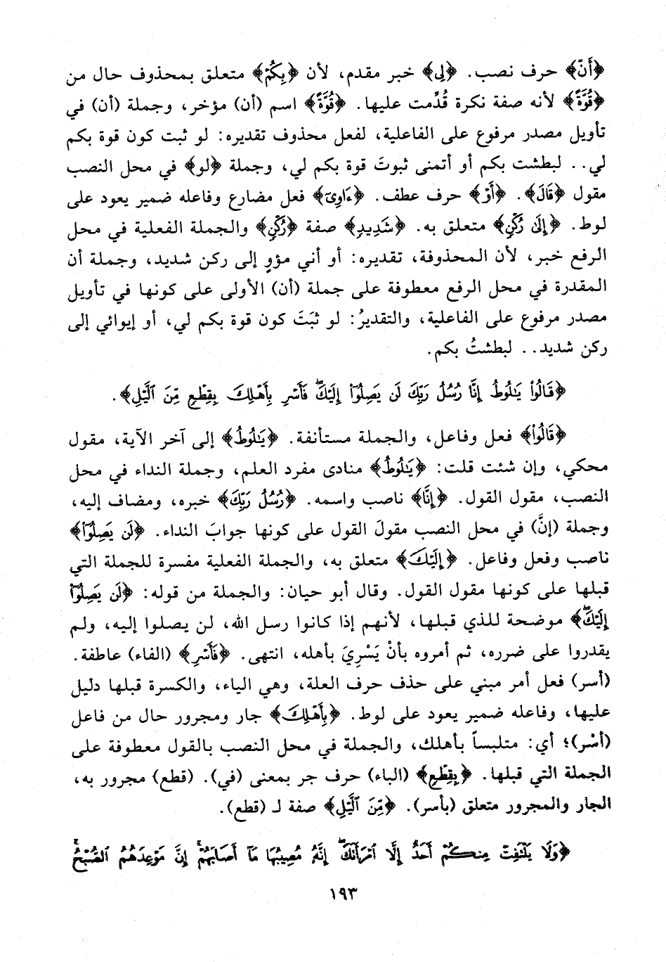 {قَالُوا} فعل وفاعل، والجملة مستأنفة. {يَا لُوطُ} إلى آخر الآية، مقول محكي، وإن شئت قلت: {يَا لُوطُ} منادى مفرد العلم، وجملة النداء في محل النصب، مقول القول. {إِنَّا} ناصب واسمه. {رُسُلُ رَبِّكَ} خبره، ومضاف إليه، وجملة (إنَّ) في محل النصب مقولَ القول على كونها جوابَ النداء. {لَنْ يَصِلُوا} ناصب وفعل وفاعل. {إِلَيْكَ} متعلق به، والجملة الفعلية مفسرة للجملة التي قبلها على كونها مقول القول. وقال أبو حيان: والجملة من قوله: {لَنْ يَصِلُوا إِلَيْكَ} موضحة للذي قبلها, لأنهم إذا كانوا رسل الله، لن يصلوا إليه، ولم يقدروا على ضرره، ثم أمروه بأنْ يَسْرِيَ بأهله، انتهى. {فَأَسْرِ} (الفاء) عاطفة. (أسر) فعل أمر مبني على حذف حرف العلة، وهي الياء، والكسرة قبلها دليل عليها، وفاعله ضمير يعود على لوط. {بِأَهْلِكَ} جار ومجرور حال من فاعل (أسْر)؛ أي: متلبسًا بأهلك، والجملة في محل النصب بالقول معطوفة على الجملة التي قبلها. {بِقِطْعٍ} (الباء) حرف جر بمعنى (في). (قطع) مجرور به، الجار والمجرور متعلق (بأسر). {مِنَ اللَّيْلِ} صفه لـ (قطع).