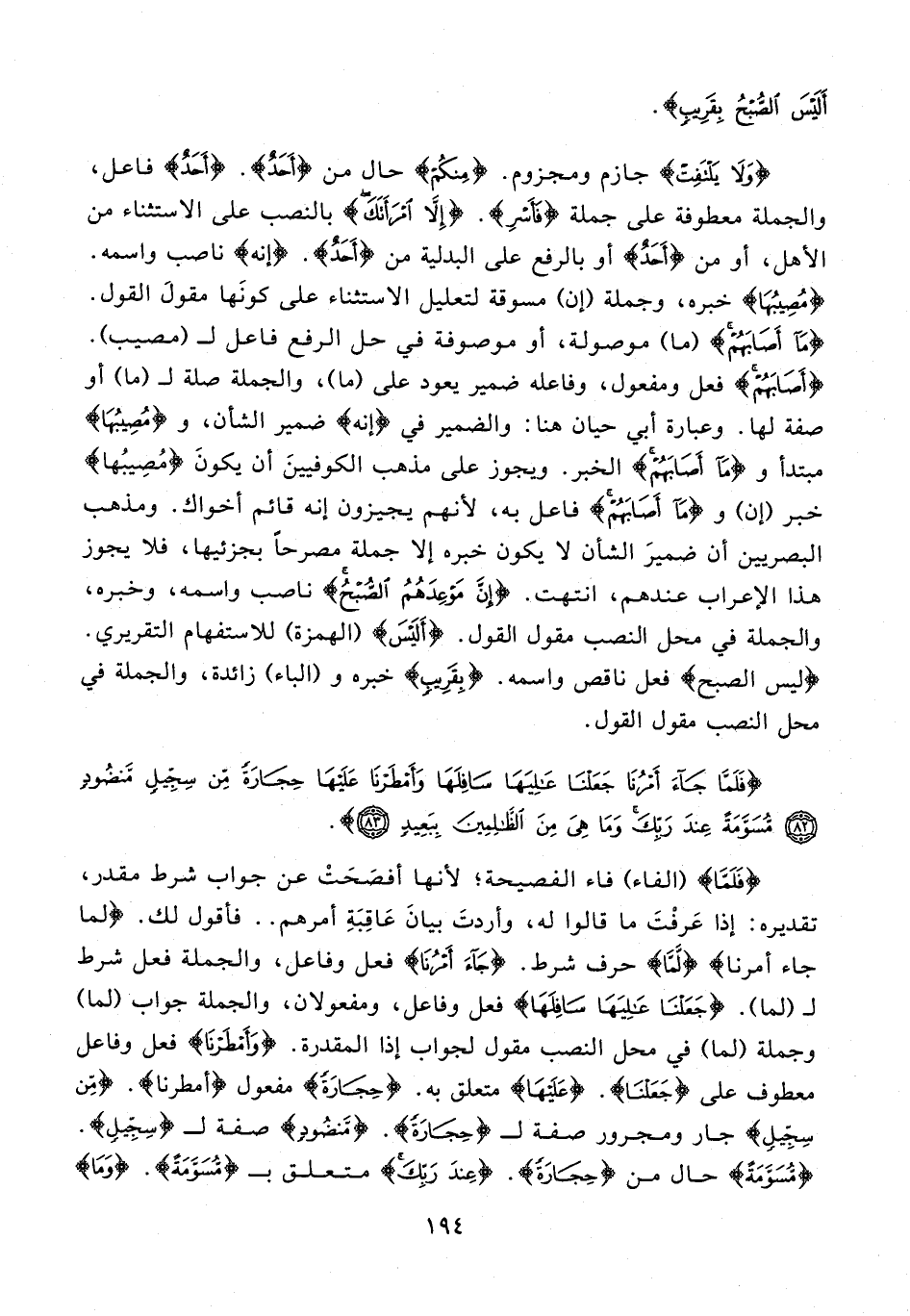 {وَلَا يَلْتَفِتْ} جازم ومجزوم. {مِنْكُمْ} حال من {أَحَدٌ}. {أَحَدٌ} فاعل، والجملة معطوفة على جملة {فَأَسْرِ}. {إِلَّا امْرَأَتَكَ} بالنصب على الاستثناء من الأهل، أو من {أَحَدٌ} أو بالرفع على البدلية من {أَحَدٌ}. {إنه} ناصب واسمه. {مُصِيبُهَا} خبره، وجملة (إن) مسوقة لتعليل الاستثناء على كونَها مقولَ القول. {مَا أَصَابَهُمْ} (ما) موصولة، أو موصوفة في حل الرفع فاعل لـ (مصيب). {أَصَابَهُمْ} فعل ومفعول، وفاعله ضمير يعود على (ما)، والجملة صلة لـ (ما) أو صفة لها. وعبارة أبي حيان هنا: والضمير في {إنه} ضمير الشأن، و {مُصِيبُهَا} مبتدأ و {مَا أَصَابَهُمْ} الخبر. ويجوز على مذهب الكوفيينَ أن يكونَ {مُصِيبُهَا} خبر (إن) و {مَا أَصَابَهُمْ} فاعل به, لأنهم يجيزون إنه قائم أخواك. ومذهب البصريين أن ضميرَ الشأن لا يكون خبره إلا جملة مصرحًا بجزئيها، فلا يجوز هذا الإعراب عندهم، انتهت. {إِنَّ مَوْعِدَهُمُ الصُّبْحُ} ناصب واسمه، وخبره، والجملة في محل النصب مقول القول. {أَلَيْسَ} (الهمزة) للاستفهام التقريري. {ليس الصبح} فعل ناقص واسمه. {بِقَرِيبٍ} خبره و (الباء) زائدة، والجملة في محل النصب مقول القول.