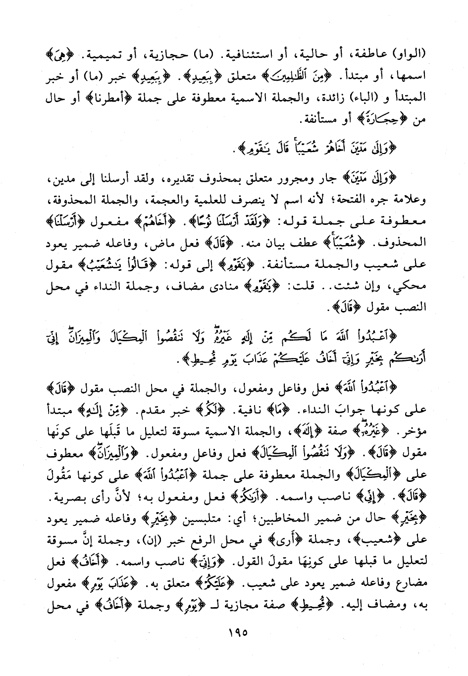 {اعْبُدُوا اللَّهَ} فعل وفاعل ومفعول، والجملة في محل النصب مقول {قَالَ} على كونها جوابَ النداء. {مَا} نافية. {لَكُمْ} خبر مقدم. {مِنْ إِلَهٍ} مبتدأ مؤخر. {غَيْرُهُ} صفة {إِلَهٍ}، والجملة الاسمية مسوقة لتعليل ما قَبلَها على كونَها مقول {قَالَ}. {وَلَا تَنْقُصُوا الْمِكْيَالَ} فعل وفاعل ومفعول. {وَالْمِيزَانَ} معطوف على {الْمِكْيَالَ} والجملة معطوفة على جملة {اعْبُدُوا اللَّهَ} على كونها مَقُولَ {قَالَ}. {إِنِّي} ناصب واسمه. {أَرَاكُمْ} فعل ومفعول به؛ لأنَّ رأى بصرية. {بِخَيْرٍ} حال من ضمير المخاطبين؛ أي: متلبسين {بِخَيْرٍ} وفاعله ضمير يعود على {شعيب}، وجملة {أَرى} في محل الرفع خبر (إن)، وجملة إنَّ مسوقة لتعليل ما قبلها على كونِهَا مقولَ القول. {وَإِنِّي} ناصب واسمه. {أَخَافُ} فعل مضارع وفاعله ضمير يعود على شعيب. {عَلَيْكُمْ} متعلق به. {عَذَابَ يَوْمٍ} مفعول به، ومضاف إليه. {مُحِيطٍ} صفة مجازية لـ {يَوْمٍ} وجملة {أَخَافُ} في محل