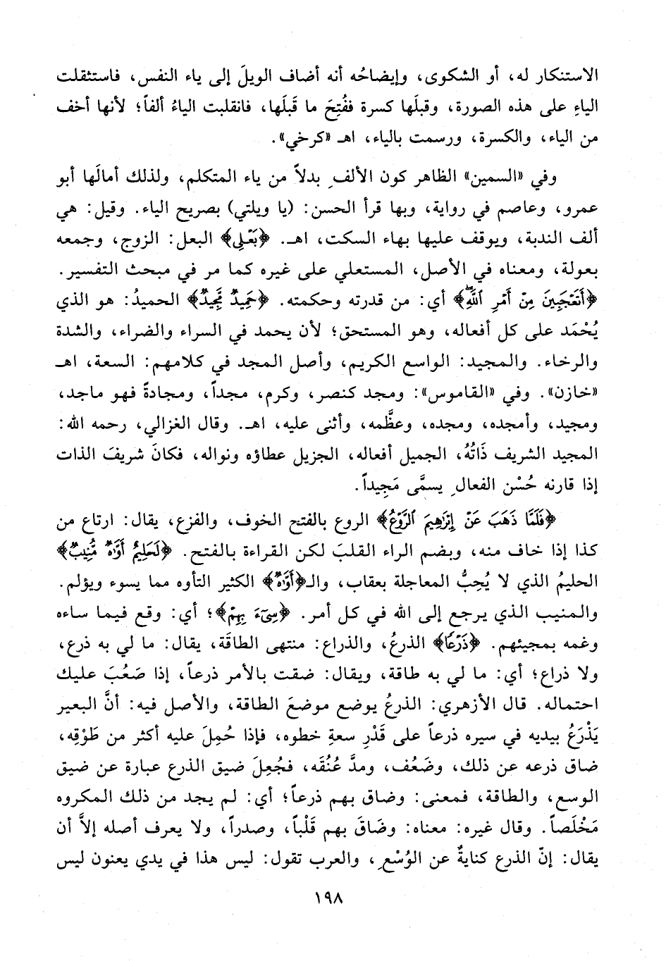 {فَلَمَّا ذَهَبَ عَنْ إِبْرَاهِيمَ الرَّوْعُ} الروع بالفتح الخوف، والفزع، يقال: ارتاع من كذا إذا خاف منه، وبضم الراء القلبَ لكن القراءة بالفتح. {لَحَلِيمٌ أَوَّاهٌ مُنِيبٌ} الحليمُ الذي لا يُحِبُّ المعاجلة بعقاب، والـ {أَوَّاهٌ} الكثير التأوه مما يسوء ويؤلم. والمنيب الذي يرجع إلى الله في كل أمر. {سِيءَ بِهِمْ}؛ أي: وقع فيما ساءه وغمه بمجيئهم. {ذَرْعًا} الذرعُ، والذراع: منتهى الطاقَة، يقال: ما لي به ذرع، ولا ذراع؛ أي: ما لي به طاقة، ويقال: ضقت بالأمر ذرعًا، إذا صَعُبَ عليك احتماله. قال الأزهري: الذرعُ يوضع موضعَ الطاقة، والأصل فيه: أنَّ البعير يَذْرَعُ بيديه في سيره ذرعًا على قَدْرِ سعةِ خطوه، فإذا حُمِلَ عليه أكثر من طَوْقِه، ضاق ذرعه عن ذلك، وضَعُف، ومدَّ عُنُقَه، فجُعِلَ ضيق الذرع عبارة عن ضيق الوسع، والطاقة، فمعنى: وضاق بهم ذرعًا؛ أي: لم يجد من ذلك المكروه مَخْلَصًا. وقال غيره: معناه: وضَاقَ بهم قَلْبًا، وصدرًا، ولا يعرف أصله إلَّا أن يقال: إنّ الذرع كنايةٌ عن الوُسْعِ، والعرب تقول: ليس هذا في يدي يعنون ليس