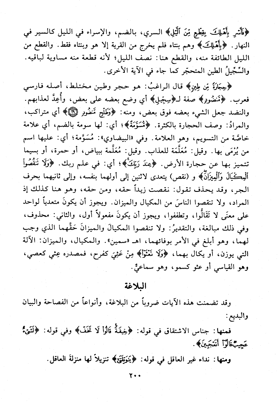 {فَأَسْرِ بِأَهْلِكَ بِقِطْعٍ مِنَ اللَّيْلِ} السري، بالضم، والإسراء في الليل كالسير في النهار. {بِأَهْلِكَ} وهم بنتاه فلم يخرج من القرية إلا هو وبنتاه فقط. والقطع من الليل الطائفة منه، والقطع هنا: نصف الليل؛ لأنه قطعة منه مساوية لباقيه.