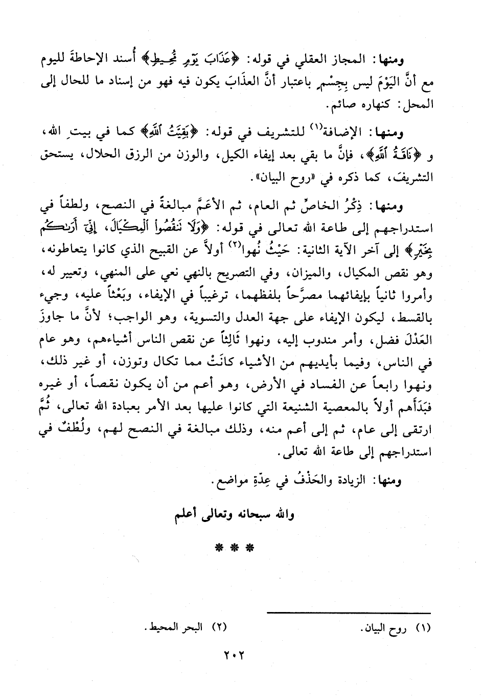 ومنها: المجاز العقلي في قوله: {عَذَابَ يَوْمٍ مُحِيطٍ} أُسند الإحاطةَ لليوم مع أنَّ اليَوْمَ ليس بِجِسْمٍ باعتبار أنَّ العذَابَ يكون فيه فهو من إسناد ما للحال إلى المحل: كنهاره صائم.