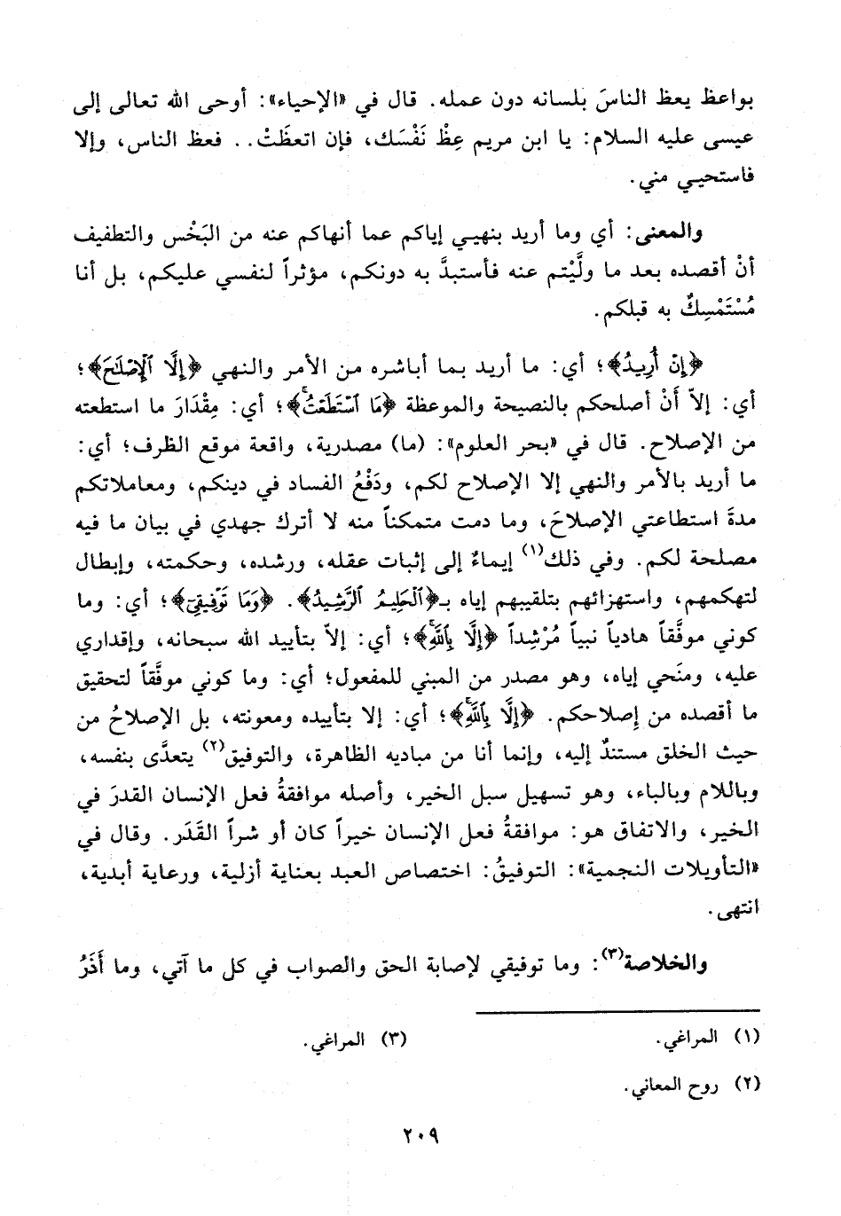 {إِنْ أُرِيدُ}؛ أي: ما أريد بما أباشره من الأمر والنهي {إِلَّا الْإِصْلَاحَ}؛ أي: إلَّا أَنْ أصلحكم بالنصيحة والموعظة {مَا اسْتَطَعْتُ}؛ أي: مِقْدَارَ ما استطعته من الإصلاح. قال في "بحر العلوم": (ما) مصدرية، واقعة موقع الظرف؛ أي: ما أريد بالأمر والنهي إلا الإصلاح لكم، ودَفْعُ الفساد في دينكم، ومعاملاتكم مدةَ استطاعتي الإصلاحَ، وما دمت متمكنًا منه لا أترك جهدي في بيان ما فيه مصلحة لكم. وفي ذلك (¬1) إيماءٌ إلى إثبات عقله، ورشده، وحكمته، وإبطال لتهكمهم، واستهزائهم بتلقيبهم إياه بـ {الْحَلِيمُ الرَّشِيدُ}. {وَمَا تَوْفِيقِي}؛ أي: وما كوني موفَّقًا هاديًا نبيًّا مُرْشِدًا {إِلَّا بِاللَّهِ}؛ أي: إلَّا بتأييد الله سبحانه، وإقداري عليه، ومَنحي إياه، وهو مصدر من المبني للمفعول؛ أي: وما كوني موفَّقًا لتحقيق ما أقصده من إِصلاحكم. {إِلَّا بِاللَّهِ}؛ أي: إلا بتأييده ومعونته، بل الإصلاحُ من حيث الخلق مستندٌ إليه، وإنما أنا من مباديه الظاهرة، والتوفيق (¬2) يتعدَّى بنفسه، وباللام وبالباء، وهو تسهيل سبل الخير، وأصله موافقةُ فعل الإنسان القدرَ في الخير، والاتفاق هو: موافقةُ فعل الإنسان خيرًا كان أو شرًّا القَدَر. وقال في "التأويلات النجمية": التوفيقُ: اختصاص العبد بعناية أزلية، ورعاية أبدية، انتهى.