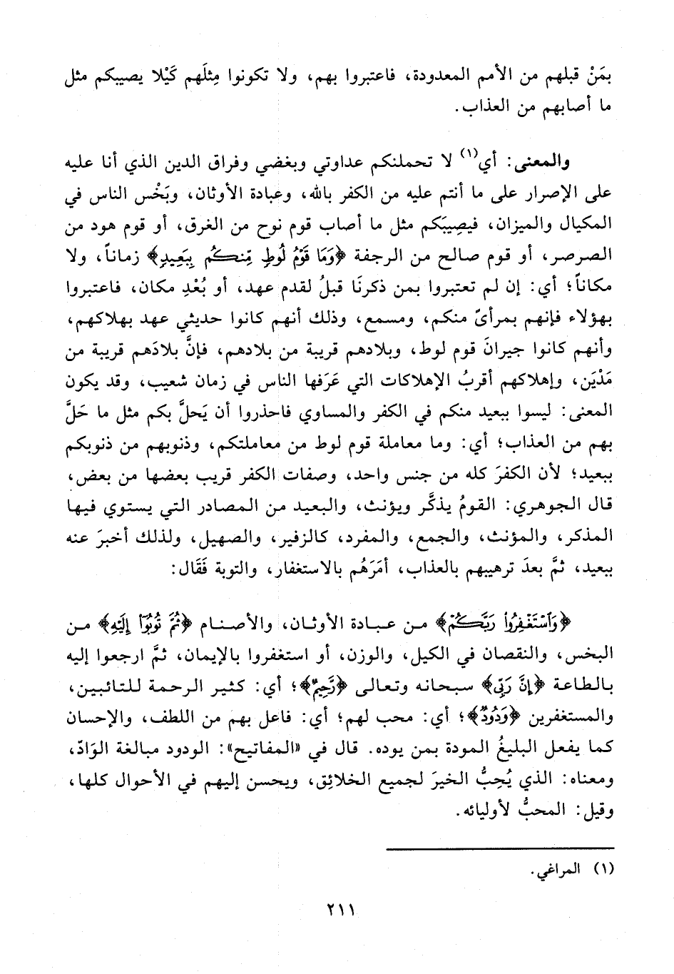 والمعنى: أي (¬1) لا تحملنكم عداوتي وبغضي وفراق الدين الذي أنا عليه على الإصرار على ما أنتم عليه من الكفر بالله، وعبادة الأوثان، وبَخْس الناس في المكيال والميزان, فيصِيبَكم مثل ما أصاب قوم نوح من الغرق، أو قوم هود من الصرصر، أو قوم صالح من الرجفة {وَمَا قَوْمُ لُوطٍ مِنْكُمْ بِبَعِيدٍ} زمانًا، ولا مكانًا؛ أي: إن لم تعتبروا بمن ذكرنَا قبلُ لقدم عهد، أو بُعْدِ مكان، فاعتبروا بهؤلاء فإنهم بمرأىً منكم، ومسمع، وذلك أنهم كانوا حديثي عهد بهلاكهم، وأنهم كانوا جيرانَ قوم لوط، وبلادهم قريبة من بلادهم، فإنَّ بلادَهم قريبة من مَدْيَن، وإهلاكهم أقربُ الإهلاكات التي عَرَفها الناس في زمان شعيب، وقد يكون المعنى: ليسوا ببعيد منكم في الكفر والمساوي فاحذروا أن يَحلَّ بكم مثل ما حَلَّ بهم من العذاب؛ أي: وما معاملة قوم لوط من معاملتكم، وذنوبهم من ذنوبكم ببعيد؛ لأن الكفرَ كله من جنس واحد، وصفات الكفر قريب بعضها من بعض، قال الجوهري: القومُ يذكَّر ويؤنث، والبعيد من المصادر التي يستوي فيها المذكر، والمؤنث، والجمع، والمفرد، كالزفير، والصهيل، ولذلك أخبرَ عنه ببعيد، ثمَّ بعدَ ترهيبهم بالعذاب، أمَرَهُم بالاستغفار، والتوبة فَقَال: