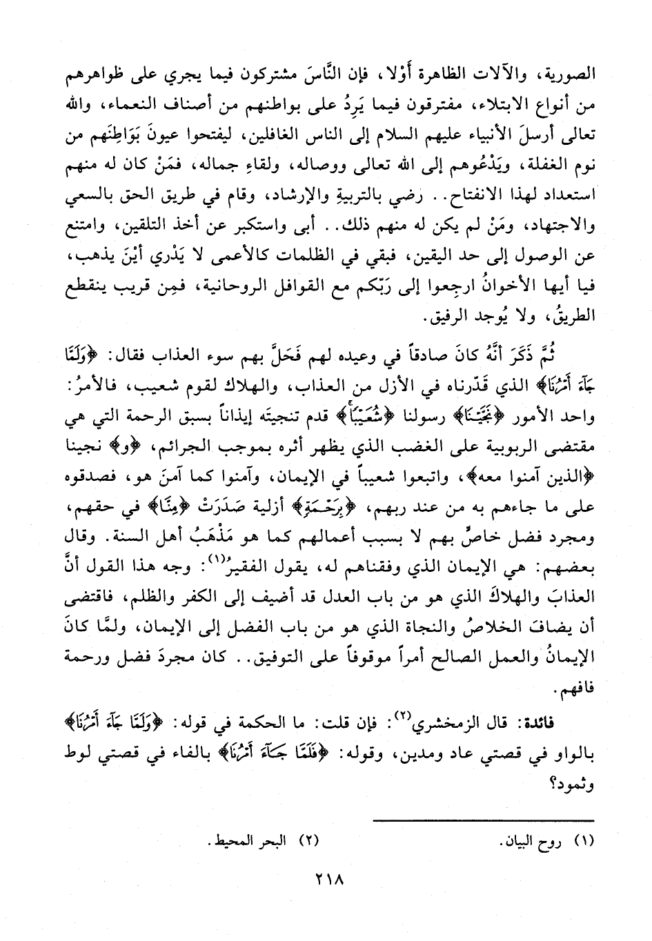 94 - ثُمَّ ذَكَرَ أنَّهُ كانَ صادقًا في وعيده لهم فَحَلَّ بهم سوء العذاب فقال: {وَلَمَّا جَاءَ أَمْرُنَا} الذي قَدّرناه في الأزل من العذاب، والهلاك لقوم شعيب، فالأمرُ: واحد الأمور {نَجَّيْنَا} رسولنا {شُعَيْبًا} قدم تنجيتَه إيذانًا بسبق الرحمة التي هي مقتضى الربوبية على الغضب الذي يظهر أثره بموجب الجرائم، {و} نجينا {الذين آمنوا معه}، واتبعوا شعيبًا في الإيمان, وآمنوا كما آمنَ هو، فصدقوه على ما جاءهم به من عند ربهم، {بِرَحْمَةٍ} أزلية صَدَرَتْ {مِنَّا} في حقهم، ومجرد فضل خاصٍّ بهم لا بسبب أعمالهم كما هو مَذْهَبُ أهل السنة. وقال بعضهم: هي الإيمان الذي وفقناهم له، يقول الفقيرُ (¬1): وجه هذا القول أنَّ العذابَ والهلاكَ الذي هو من باب العدل قد أضيف إلى الكفر والظلم، فاقتضى أن يضافَ الخلاصُ والنجاة الذي هو من باب الفضل إلى الإيمان, ولمَّا كانَ الإيمانُ والعمل الصالح أمرًا موقوفًا على التوفيق .. كان مجردَ فضل ورحمة فافهم.