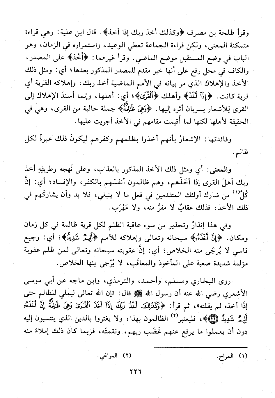 وفي هذا إنذارٌ وتحذير من سوء عاقبة الظلم لكل قرية ظالمة في كل زمان ومكان. {إِنَّ أَخْذَهُ} سبحانه وتعالى وإهلاكه للأمم {أَلِيمٌ شَدِيدٌ}؛ أي: وجيع قاسي لا يُرجَى منه الخلاص؛ أي: إنَّ عقوبته سبحانه وتعالى لمن ظلم عقوبة مؤلمة شديدة صعبة على المأخوذ والمعاقَب، لا يُرْجى مِنها الخلاص.