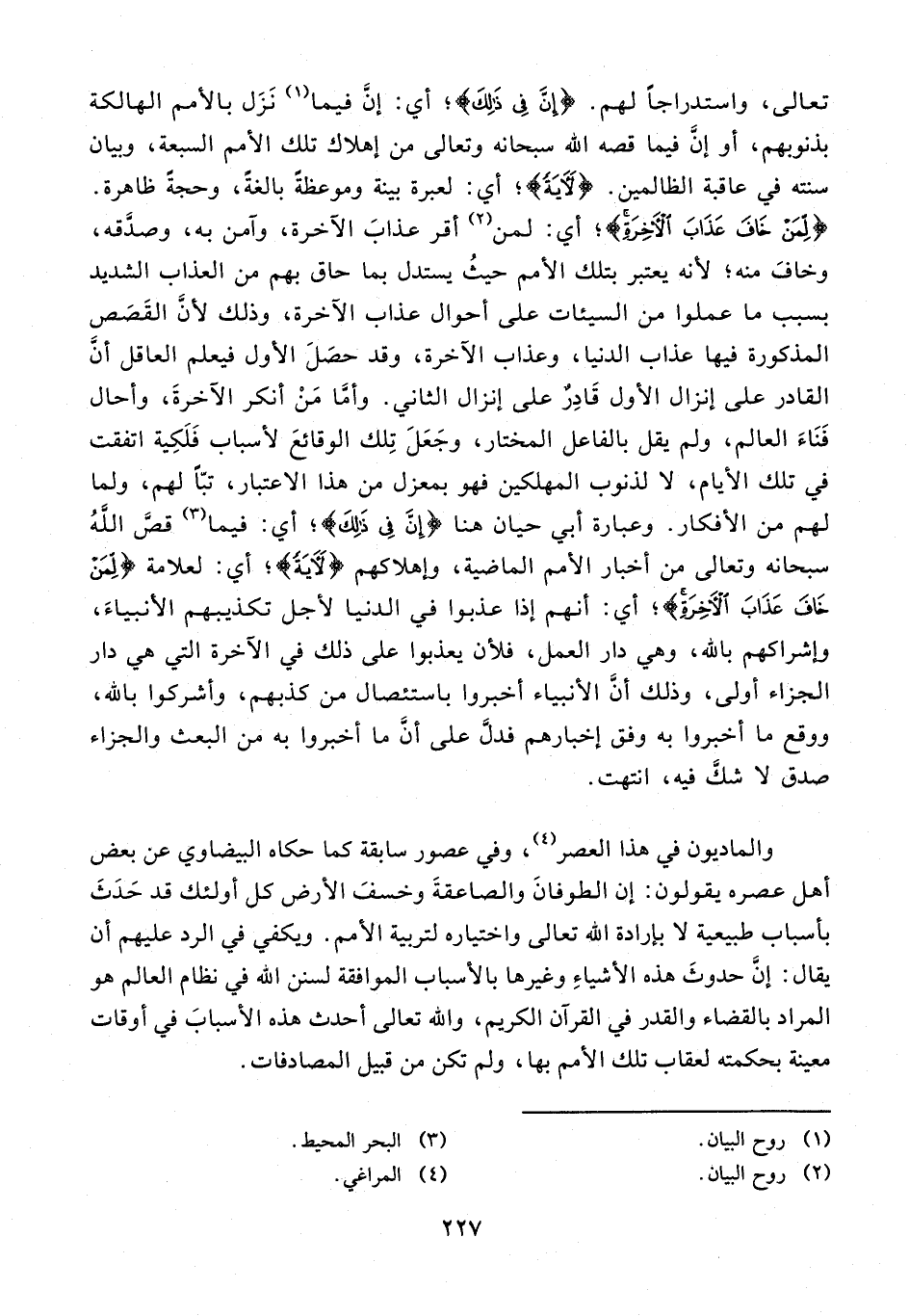 والماديون في هذا العصر (¬4)، وفي عصور سابقة كما حكاه البيضاوي عن بعض أهل عصره يقولون: إن الطوفانَ والصاعقةَ وخسفَ الأرض كل أولئك قد حَدَثَ بأسباب طبيعية لا بإرادة الله تعالى واختياره لتربية الأمم. ويكفي في الرد عليهم أن يقال: إنَّ حدوثَ هذه الأشياءِ وغيرها بالأسباب الموافقة لسنن الله في نظام العالم هو المراد بالقضاء والقدر في القرآن الكريم، والله تعالى أحدث هذه الأسبابَ في أوقات معينة بحكمته لعقاب تلك الأمم بها, ولم تكن من قبيل المصادفات.