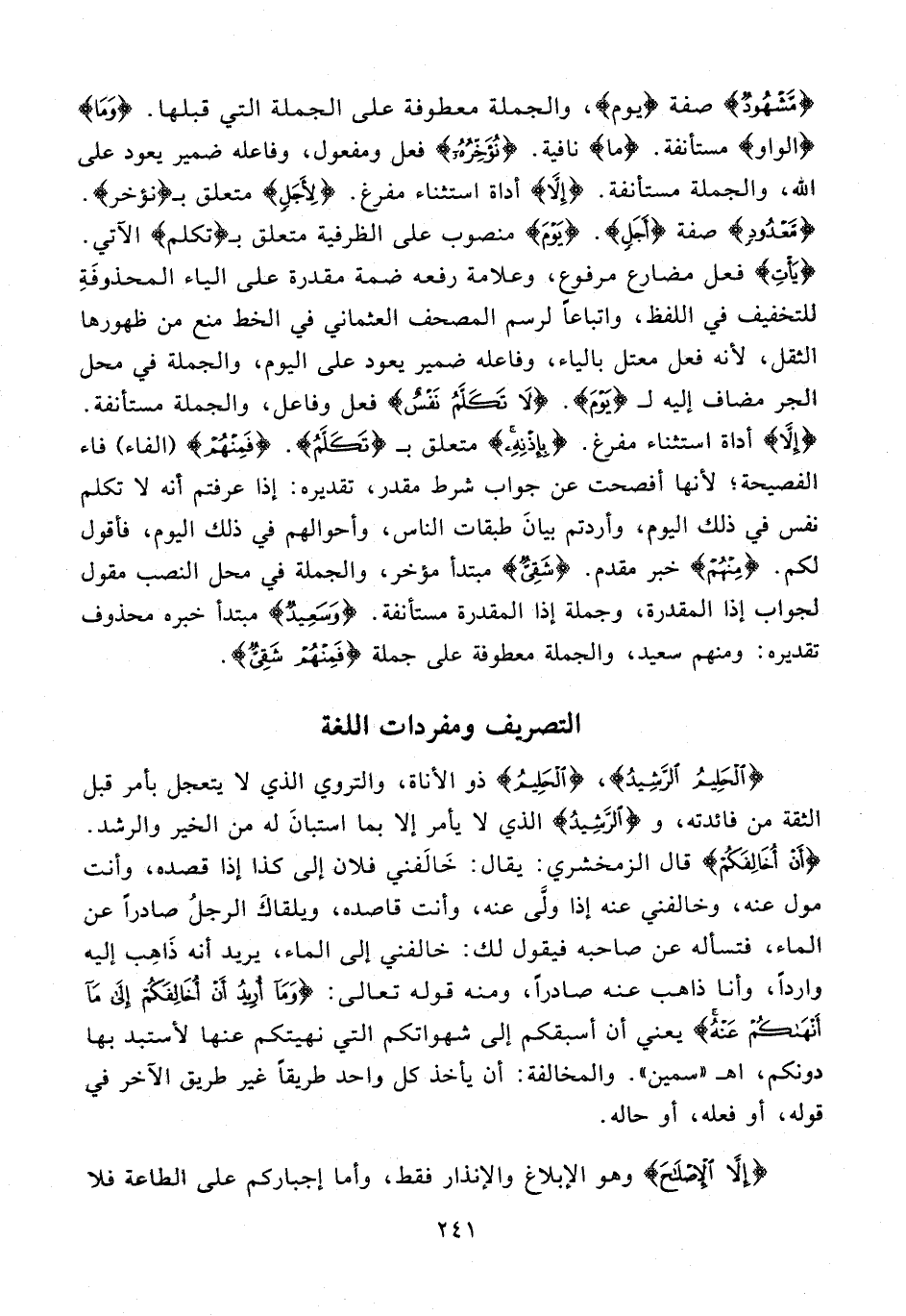 {مَشْهُودٌ} صفة {يوم}، والجملة معطوفة على الجملة التي قبلها. {وَمَا} {الواو} مستأنفة. {ما} نافية. {نُؤَخِّرُهُ} فعل ومفعول، وفاعله ضمير يعود على الله، والجملة مستأنفة. {إِلَّا} أداة استثناء مفرغ. {لِأَجَلٍ} متعلق بـ {نؤخر}. {مَعْدُودٍ} صفة {أَجَلٍ}. {يَوْمَ} منصوب على الظرفية متعلق بـ {تكلم} الآتي. {يَأْتِ} فعل مضارع مرفوع، وعلامة رفعه ضمة مقدرة على الياء المحذوفَةِ للتخفيف في اللفظ، واتباعًا لرسم المصحف العثماني في الخط منع من ظهورها الثقل, لأنه فعل معتل بالياء، وفاعله ضمير يعود على اليوم، والجملة في محل الجر مضاف إليه لـ {يَوْمَ}. {لَا تَكَلَّمُ نَفْسٌ} فعل وفاعل، والجملة مستأنفة. {إِلَّا} أداة استثناء مفرغ. {بِإِذْنِهِ} متعلق بـ {تَكَلَّمُ}. {فَمِنْهُمْ} (الفاء) فاء الفصيحة؛ لأنها أفصحت عن جواب شرط مقدر، تقديره: إذا عرفتم أنه لا تكلم نفس في ذلك اليوم، وأردتم بيانَ طبقات الناس، وأحوالهم في ذلك اليوم، فأقول لكم. {مِنْهُمْ} خبر مقدم. {شَقِيٌّ} مبتدأ مؤخر، والجملة في محل النصب مقول لجواب إذا المقدرة، وجملة إذا المقدرة مستأنفة. {وَسَعِيدٌ} مبتدأ خبره محذوف تقديره: ومنهم سعيد، والجملة معطوفة على جملة {فَمِنْهُمْ شَقِيٌّ}.