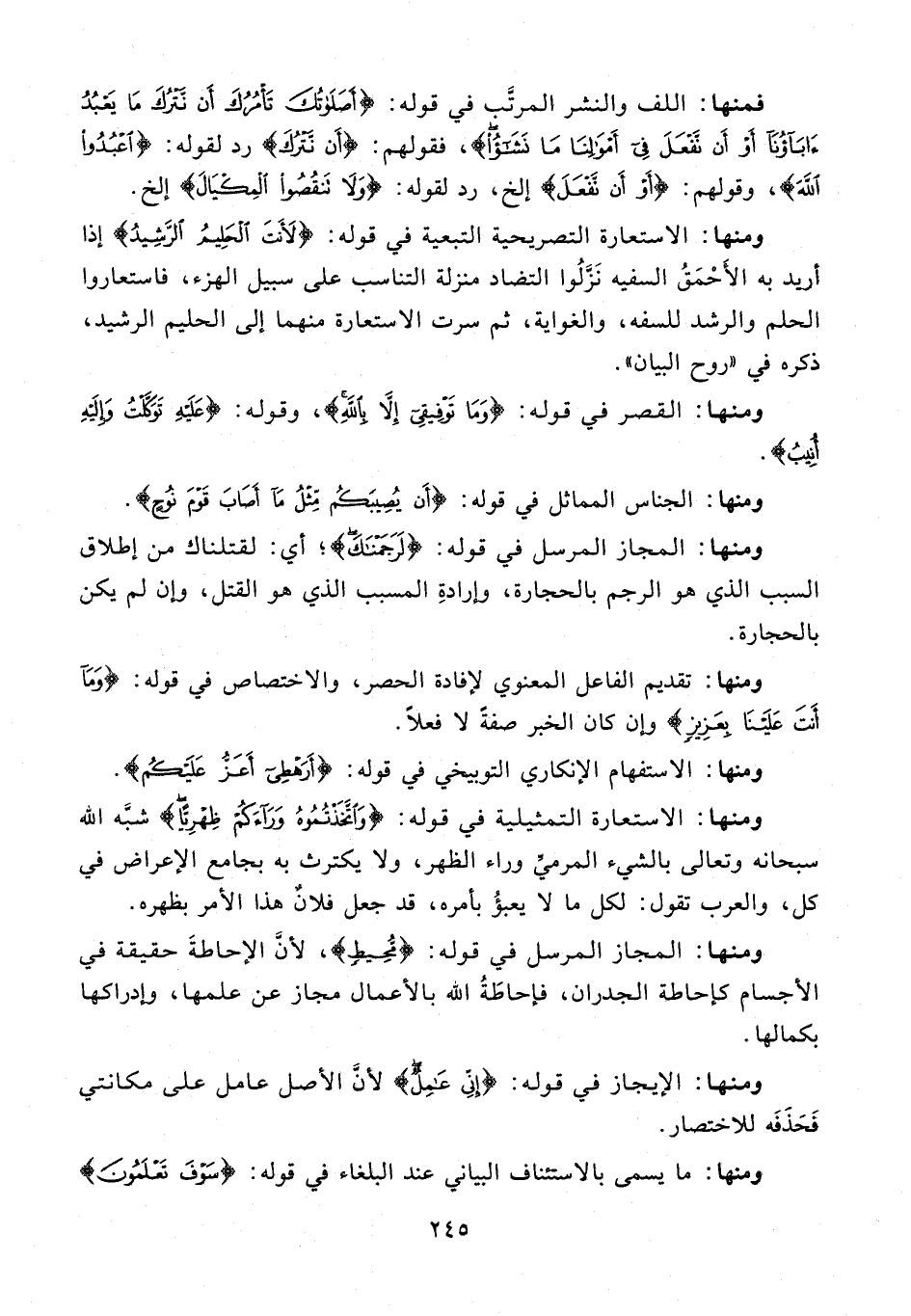فمنها: اللف والنشر المرتَّب في قوله: {أَصَلَاتُكَ تَأْمُرُكَ أَنْ نَتْرُكَ مَا يَعْبُدُ آبَاؤُنَا أَوْ أَنْ نَفْعَلَ فِي أَمْوَالِنَا مَا نَشَاءُ}، فقولهم: {أَنْ نَتْرُكَ} رد لقوله: {اعْبُدُوا اللَّهَ}، وقولهم: {أَوْ أَنْ نَفْعَلَ} إلخ، رد لقوله: {وَلَا تَنْقُصُوا الْمِكْيَالَ} إلخ.