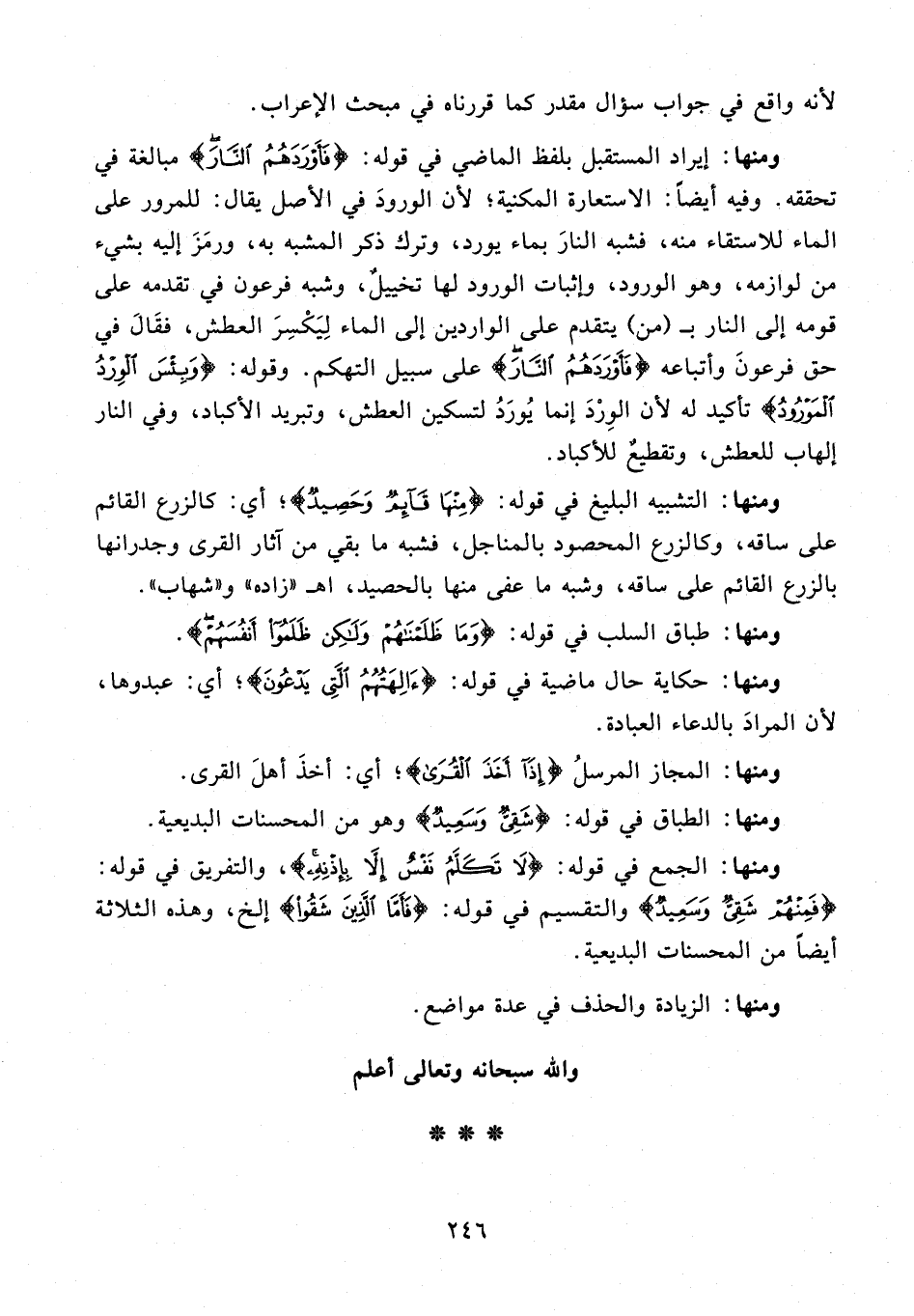 ومنها: إيراد المستقبل بلفظ الماضي في قوله: {فَأَوْرَدَهُمُ النَّارَ} مبالغة في تحققه. وفيه أيضًا: الاستعارة المكنية؛ لأن الورودَ في الأصل يقال: للمرور على الماء للاستقاء منه، فشبه النارَ بماء يورد، وترك ذكر المشبه به، ورمَزَ إليه بشيء من لوازمه، وهو الورود، وإثبات الورود لها تخييلٌ، وشبه فرعون في تقدمه على قومه إلى النار بـ (من) يتقدم على الواردين إلى الماء لِيَكْسِرَ العطش، فقَالَ في حق فرعونَ وأتباعه {فَأَوْرَدَهُمُ النَّارَ} على سبيل التهكم. وقوله: {وَبِئْسَ الْوِرْدُ الْمَوْرُودُ} تأكيد له لأن الوِرْدَ إنما يُورَدُ لتسكين العطش، وتبريد الأكباد، وفي النار إلهاب للعطش، وتقطيعٌ للأكباد.