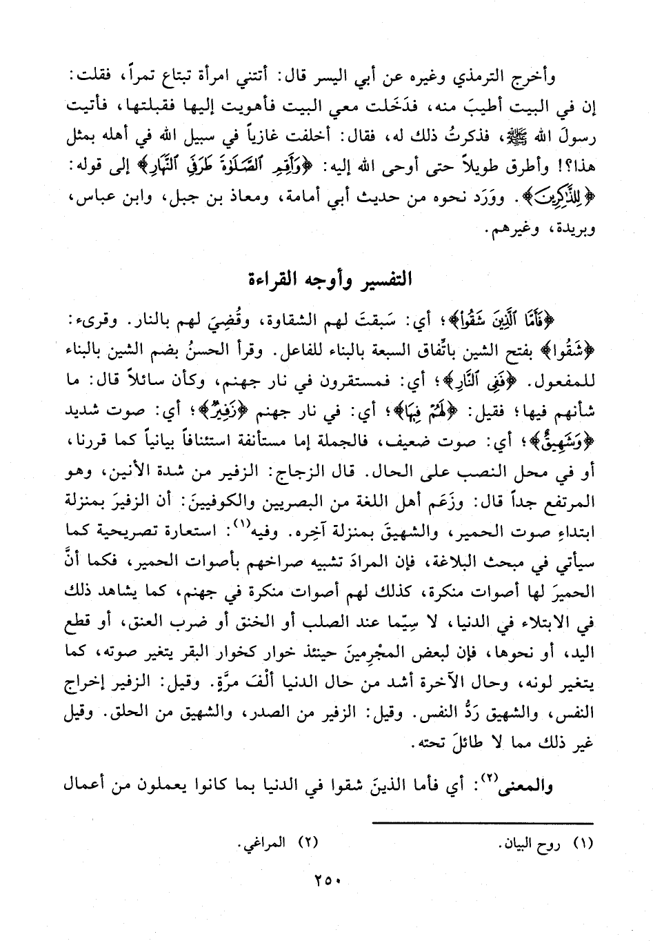 106 - {فَأَمَّا الَّذِينَ شَقُوا}؛ أي: سَبقتَ لهم الشقاوة، وقُضِيَ لهم بالنار. وقرىء: {شَقُوا} بفتح الشين باتِّفاق السبعة بالبناء للفاعل. وقرأ الحسنُ بضم الشين بالبناء للمفعول. {فَفِي النَّارِ}؛ أي: فمستقرون في نار جهنم، وكأن سائلًا قال: ما شأنهم فيها؛ فقيل: {لَهُمْ فِيهَا}؛ أي: في نار جهنم {زَفِيرٌ}؛ أي: صوت شديد {وَشَهِيقٌ}؛ أي: صوت ضعيف، فالجملة إما مستأنفة استئنافًا بيانيًّا كما قررنا، أو في محل النصب على الحال. قال الزجاج: الزفير من شدة الأنين، وهو المرتفع جدًّا قال: وزَعَم أهل اللغة من البصريين والكوفيينَ: أن الزفيرَ بمنزلة ابتداءِ صوت الحمير، والشهيقَ بمنزلة آخِره. وفيه (¬1): استعارة تصريحية كما سيأتي في مبحث البلاغة، فإن المرادَ تشبيه صراخهم بأصوات الحمير، فكما أنَّ الحميرَ لها أصوات منكرة، كذلك لهم أصوات منكرة في جهنم، كما يشاهد ذلك في الابتلاء في الدنيا، لا سِيّما عند الصلب أو الخنق أو ضرب العنق، أو قطع اليد، أو نحوها، فإن لبعض المجْرِمينَ حينئذ خوار كخوار البقر يتغير صوته، كما يتغير لونه، وحال الآخرة أشد من حال الدنيا ألْفَ مرَّةٍ. وقيل: الزفير إخراج النفس، والشهيق رَدُّ النفس. وقيل: الزفير من الصدر، والشهيق من الحلق. وقيل غير ذلك مما لا طائلَ تحته.