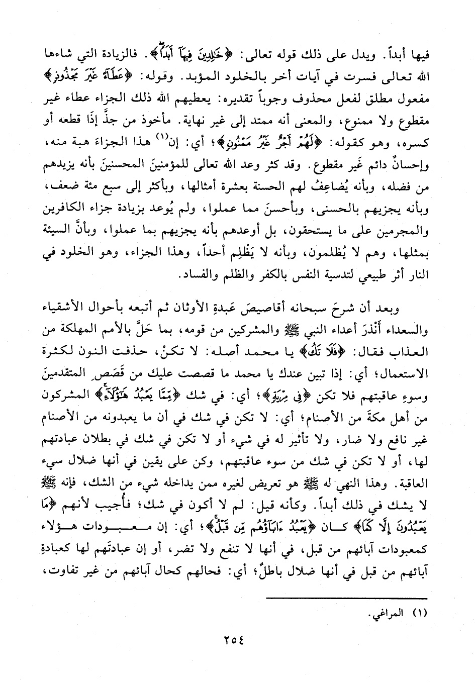 فيها أبدًا. ويدل على ذلك قوله تعالى: {خَالِدِينَ فِيهَا أَبَدًا}. فالزيادة التي شاءها الله تعالى فسرت في آيات أخر بالخلود المؤبد. وقوله: {عَطَاءً غَيْرَ مَجْذُوذٍ} مفعول مطلق لفعل محذوف وجوبًا تقديره: يعطيهم الله ذلك الجزاء عطاء غير مقطوع ولا ممنوع، والمعنى أنه ممتد إلى غير نهاية. مأخوذ من جذَّ إذَا قطعه أو كسره، وهو كقوله: {لَهُمْ أَجْرٌ غَيْرُ مَمْنُونٍ}؛ أي: إن (¬1) هذا الجزاءَ هبة منه، وإحسانٌ دائم غَير مقطوع. وقد كثر وعد الله تعالى للمؤمنينَ المحسنينَ بأنه يزيدهم من فضله، وبأنه يُضاعِفُ لهم الحسنة بعشرة أمثالها، وبأكثر إلى سبع مئة ضعف، وبأنه يجزيهم بالحسنى، وبأحسنَ مما عملوا, ولم يُوعد بزيادة جزاء الكافرين والمجرمين على ما يستحقون، بل أوعدهم بأنه يجزيهم بما عملوا، وبأنَّ السيئة بمثلها، وهم لا يُظلمون، وبأنه لا يَظْلِم أحدًا، وهذا الجزاء، وهو الخلود في النار أثر طبيعي لتدسية النفس بالكفر والظلم والفساد.