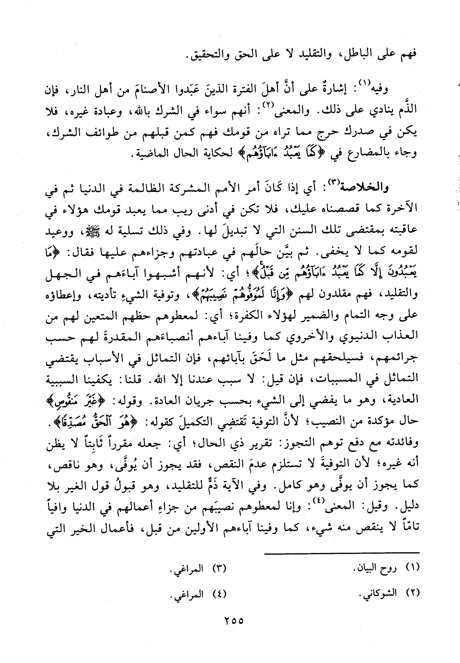 والخلاصة (¬3): أي إذا كَانَ أمر الأمم المشركة الظالمة في الدنيا ثم في الآخرة كما قصصناه عليك، فلا تكن في أدنى ريب مما يعبد قومك هؤلاء في عاقبته بمقتضى تلك السنن التي لا تبديلَ لها. وفي ذلك تسلية له - صلى الله عليه وسلم -، ووعيد لقومه كما لا يخفى. ثم بيَّن حالَهم في عبادتهم وجزاءهم عليها فقال: {مَا يَعْبُدُونَ إِلَّا كَمَا يَعْبُدُ آبَاؤُهُمْ مِنْ قَبْلُ}؛ أي: لأنهم أشبهوا آباءَهم في الجهل والتقليد، فهم مقلدون لهم {وَإِنَّا لَمُوَفُّوهُمْ نَصِيبَهُمْ}، وتوفية الشيءِ تأديته، وإعطاؤه على وجه التمام والضمير لهؤلاء الكفرة؛ أي: لمعطوهم حظهم المتعين لهم من العذاب الدنيوي والأخروي كما وفينا آباءهم أنصباءَهم المقدرةَ لهم حسب جرائمهم، فسيلحقهم مثل ما لَحَقَ بآبائهم، فإن التماثل في الأسباب يقتضي التماثل في المسببات، فإن قيل: لا سبب عندنا إلا الله. قلنا: يكفينا السببية العادية، وهو ما يفضي إلى الشيء بحسب جريان العادة. وقوله: {غَيْرَ مَنْقُوصٍ} حال مؤكدة من النصيب؛ لأنَّ التوفية تَقتضِي التكميلَ كقوله: {هُوَ الْحَقُّ مُصَدِّقًا}. وفائدته مع دفع توهم التجوز: تقرير ذي الحال؛ أي: جعله مقررًا ثَابِتًا لا يظن أنه غيره؛ لأن التوفيةَ لا تستلزم عدمَ النقص، فقد يجوز أن يُوفَّى، وهو ناقص، كما يجوز أن يوفَّى وهو كامل. وفي الآية ذَمٌّ للتقليد، وهو قبولُ قول الغير بلا دليل. وقيل: المعنى (¬4): وإنا لمعطوهم نصيبَهم من جزاءِ أعمالهم في الدنيا وافيًا تامًّا لا ينقص منه شيء، كما وفينا آباءهم الأولين من قبل، فأعمال الخير التي