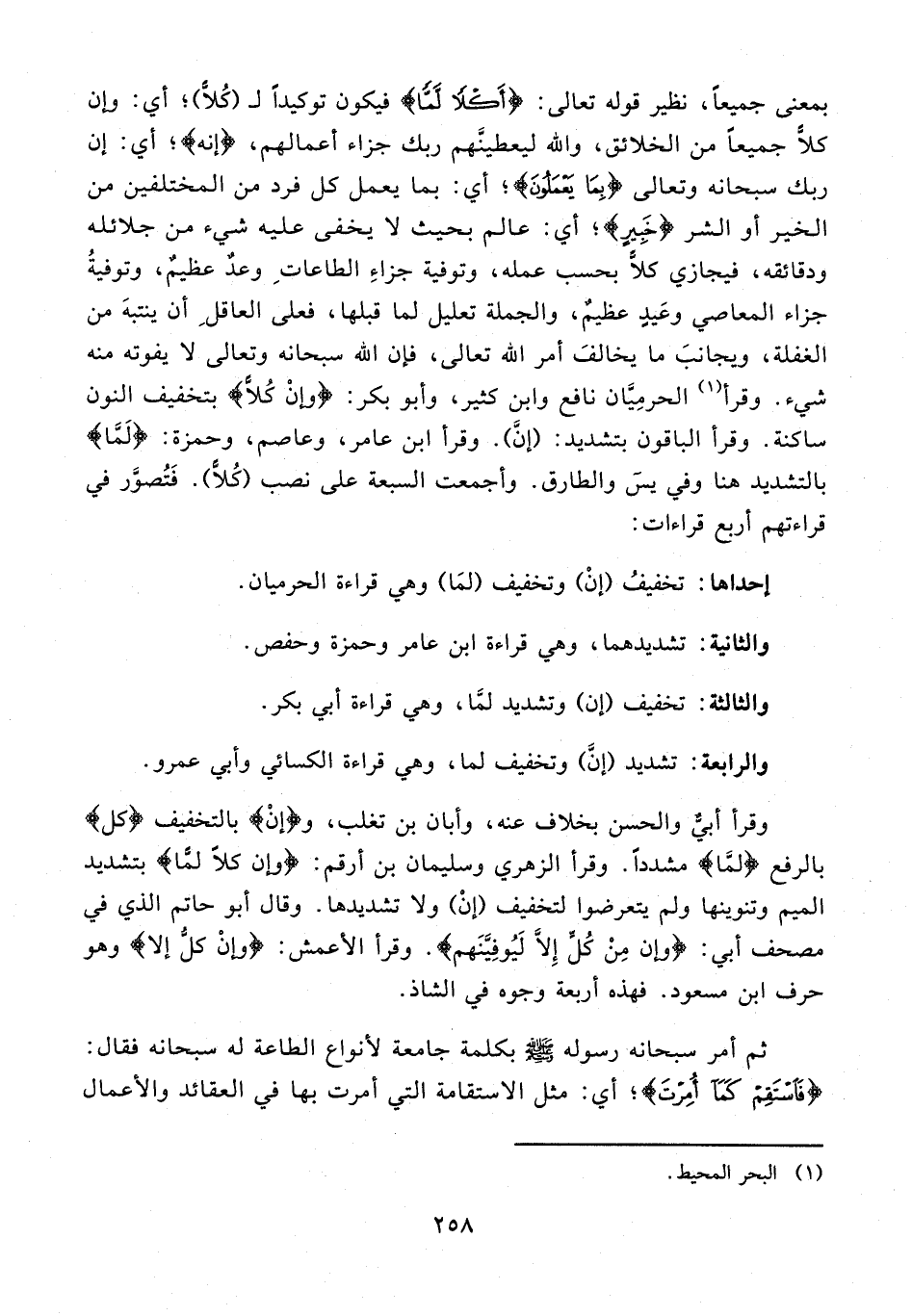 وقرأ أبيٌّ والحسن بخلاف عنه، وأبان بن تغلب، و {إنْ} بالتخفيف {كل} بالرفع {لمَّا} مشددًا. وقرأ الزهري وسليمان بن أرقم: {وَإِن كلًّا لمَّا} بتشديد الميم وتنوينها ولم يتعرضوا لتخفيف (إنْ) ولا تشديدها. وقال أبو حاتم الذي في مصحف أبي: {وإن مِنْ كُلَّ إِلَّا لَيُوفِيَّنَهم}. وقرأ الأعمش: {وإنْ كلُّ إلا} وهو حرف ابن مسعود. فهذه أربعة وجوه في الشاذ.